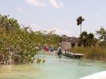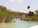 Nous la traversons et empruntons les canaux creusés par les mayas. Des ruines sont visibles, qui étaient des postes de douane à l’époque maya. L’expérience comprend 1/2 heure de nage dans un des canaux, le courant est faible mais suffisant pour nous balader sans effort au milieu de la mangrove.
