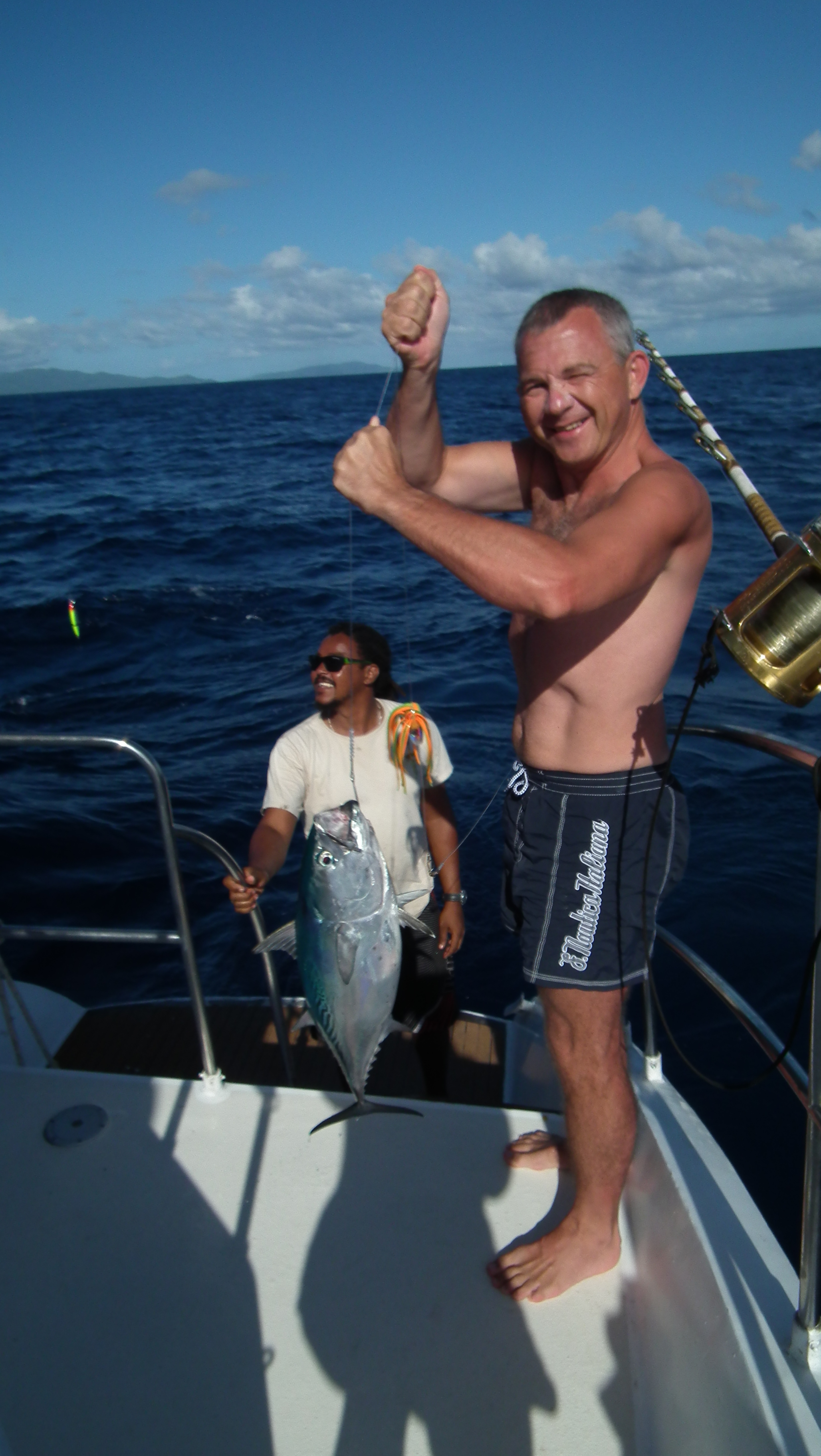 La pêche n’était pas prévue au programme de notre croisière mais nous avons eu la chance d’avoir Ron pour capitaine. Il est passionné et ses cannes trainent dès que nous naviguons plus d’une heure. Il adore partager ses connaissances, prête son matériel avec plaisir et organise différents types de pêche : à la traine, à la palangre, au calamar, etc… L’excitation a gagné tous les passagers dès le premier jour et la prise d’un espadon voilier, aussitôt préparé en poisson cru par Nelson. Nous avons péché tous les jours – barracuda, bonite, thon jaune, vivaneau – et mangé du poisson ultra frais toute la semaine.