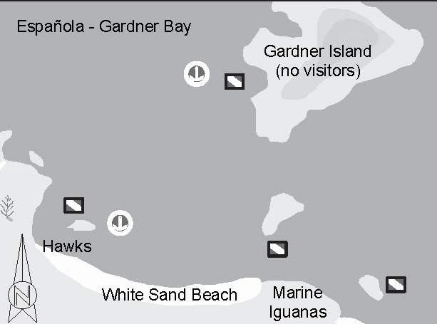 Toujours sur Española, Bahia Gardner est un des sites favoris des visiteurs, une superbe plage de sable blanc peuplée d’otaries, avec un débarquement mouillé tout à fait tranquille. Au programme : farniente sur la plage.