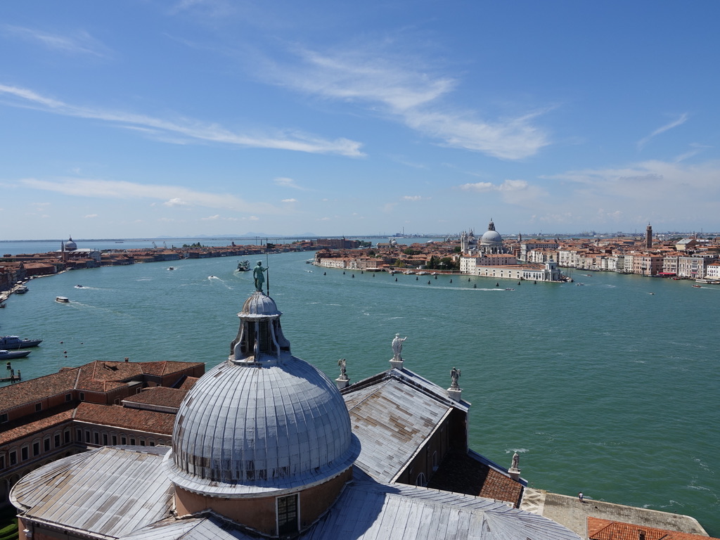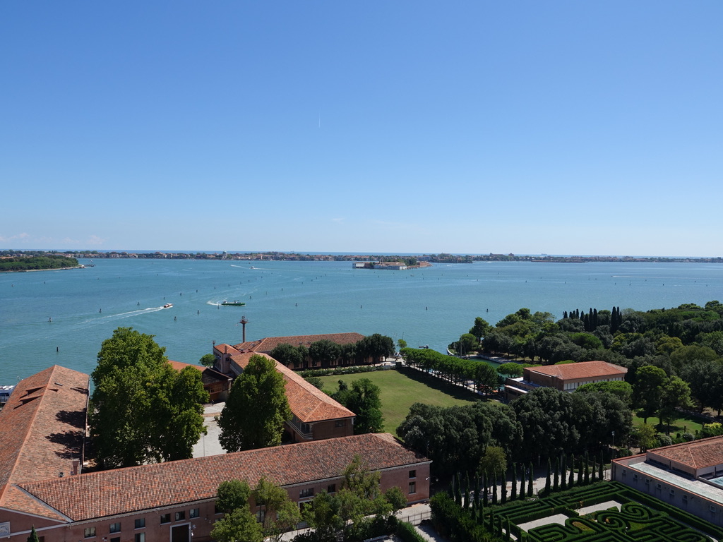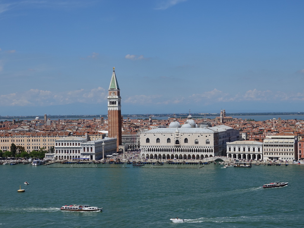 En fait, notre objectif est son campanile. Nous déboursons volontiers les 6€ permettant de prendre l’ascenseur (toujours pas de queue) et de passer un moment tout là-haut. La vue sur la lagune, le lido, les îles et la ville est fantastique.