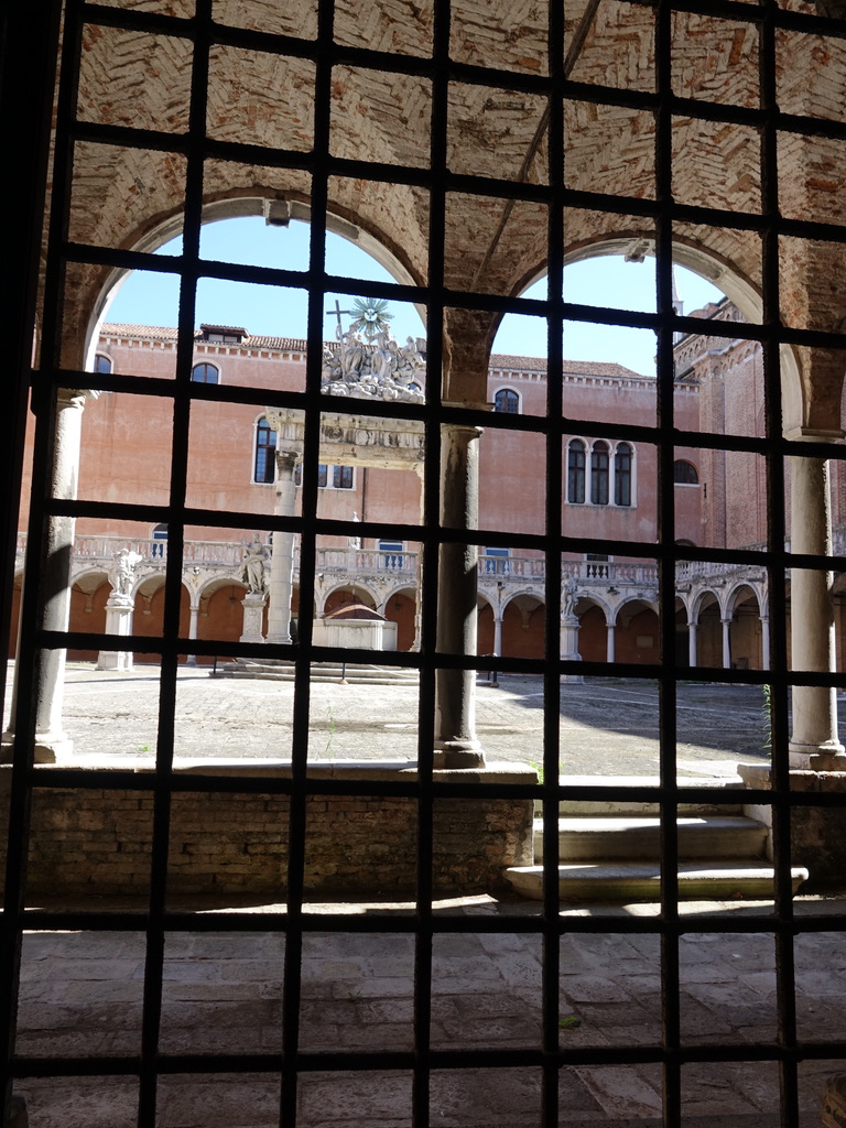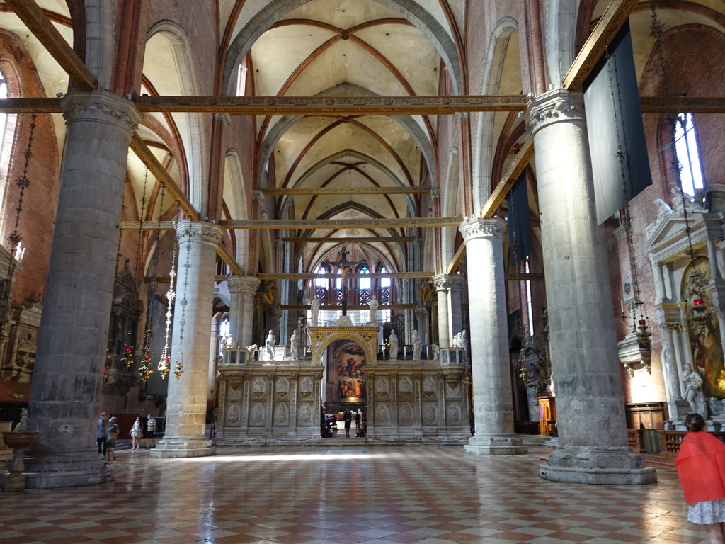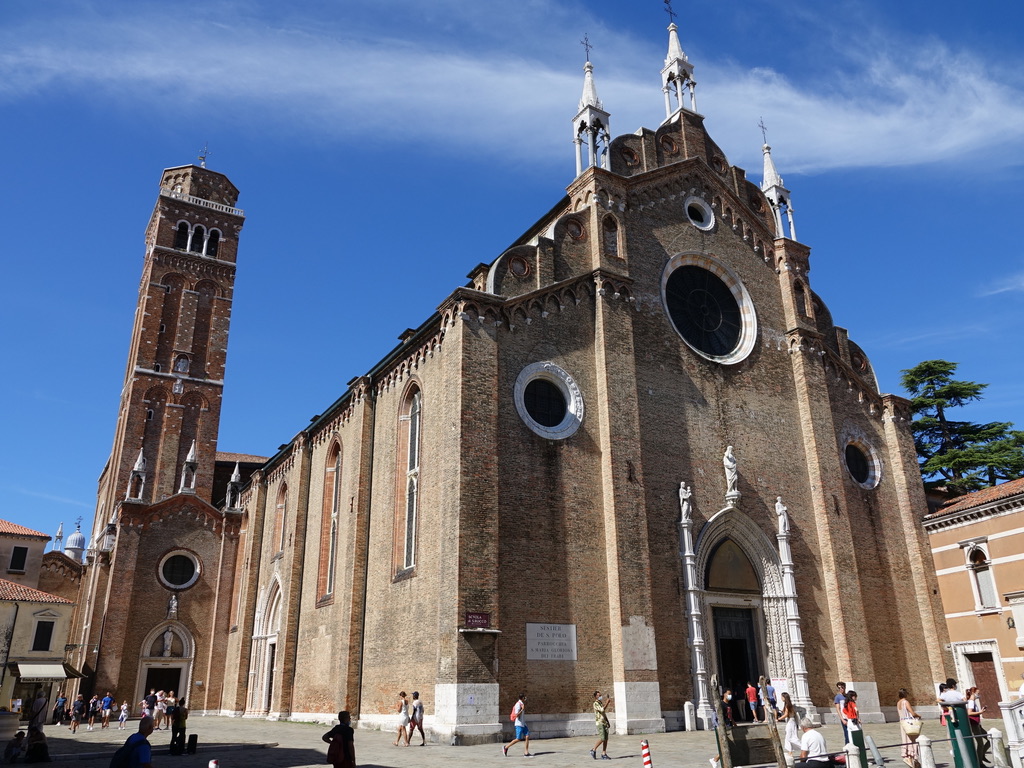 Arrêt suivant à San Polo pour la dernière visite de la matinée : la basilique gothique Santa Maria dei Frari (entrée : 3€). C’est la plus grande église de Venise. La façade est en brique, incrustée de marbre.