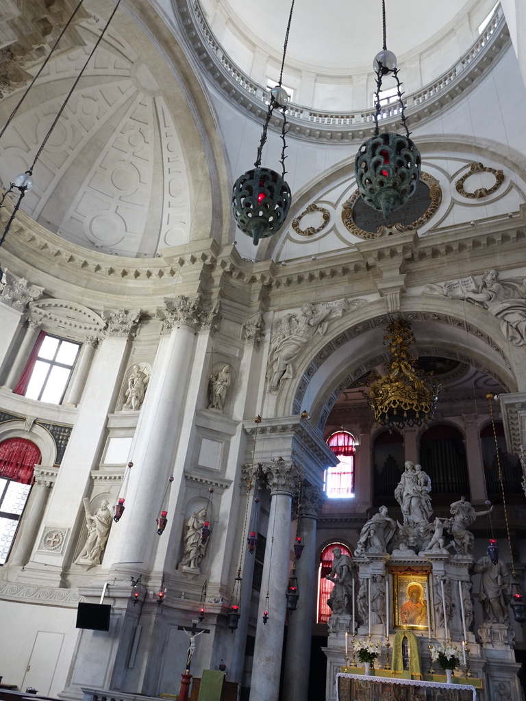 Tout en haut, une statue de la vierge bénit la ville. En fait, la basilique est une église votive. Depuis 1687, les vénitiens y viennent chaque 21 novembre pour remercier la Vierge d’avoir mis fin à une épidémie de peste.