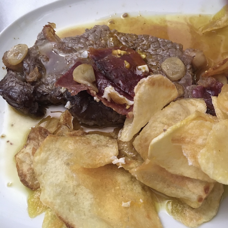 En bon français amateurs de viande saignante, nous étions un peu méfiants avec le steak à la portugaise, sur assiette (no prato) ou servi en sandwich (prego). La viande de bœuf ou de veau est coupée finement, bien cuite et servie en sauce, avec parfois un œuf au plat et des pommes de terre en rondelles frites. C’est juste un régal !
