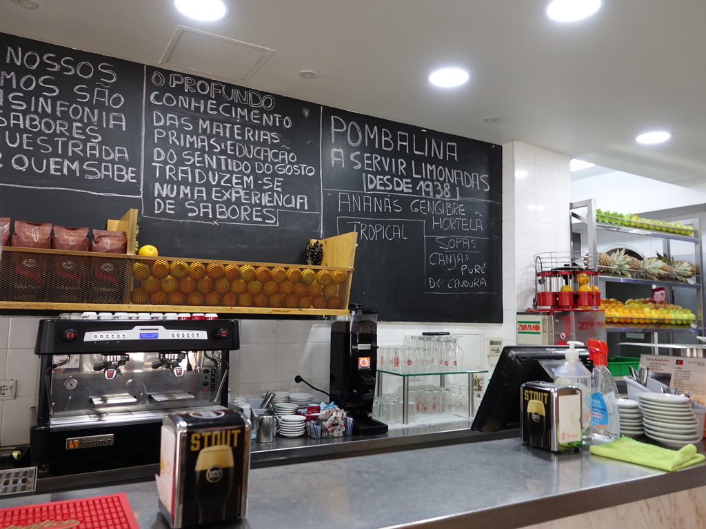 Nous prenons un déjeuner tardif à Nova Pombalina, un petit café-restaurant tout simple et très bon marché. Je recommande les jus de fruits frais – ananas-gingembre pour ma part – et le sandwich au cochon de lait à gouter absolument.