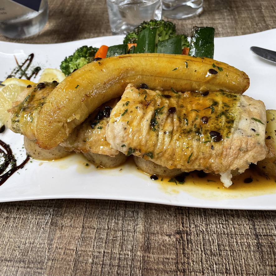Le poisson vedette est l’espada. Attention, il ne s’agit pas d’espadon mais du sabre noir, pêché la nuit en eau profonde. Il est servi légèrement pané, accompagné de légumes, d’une banane et d’une sauce maracuja.