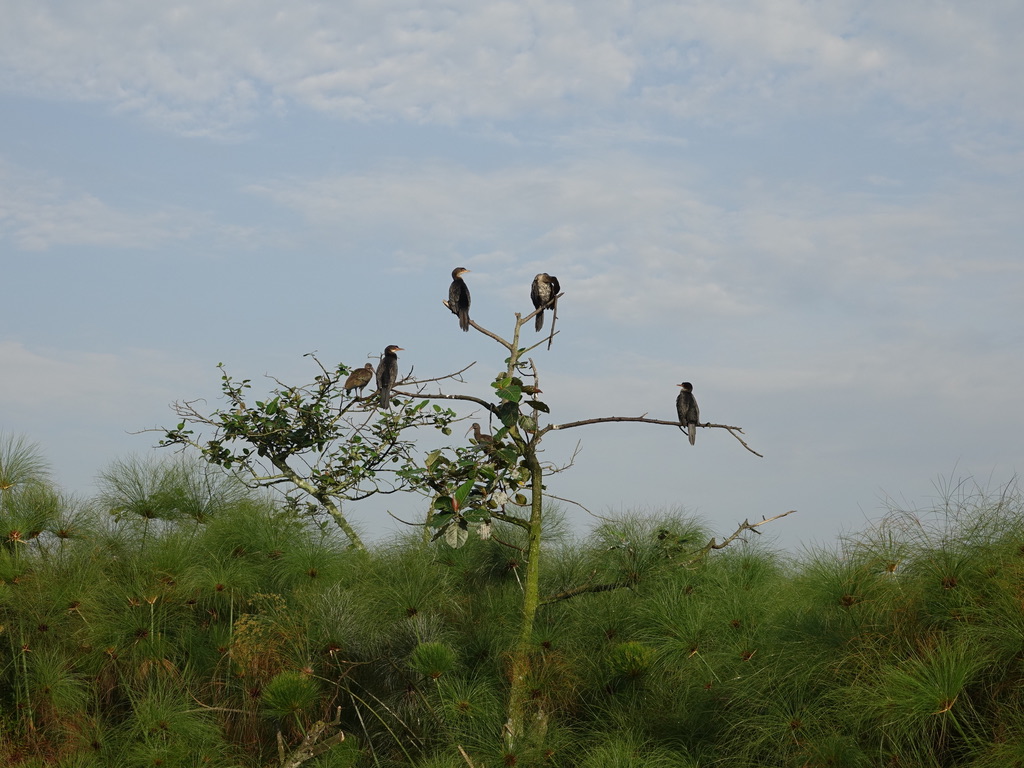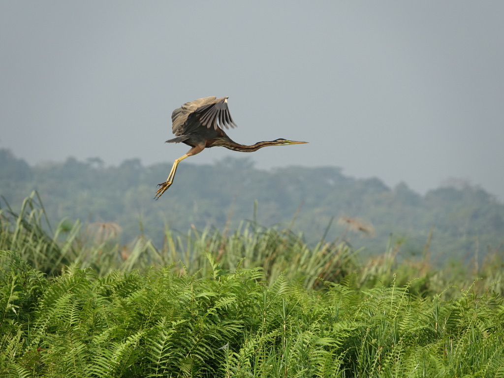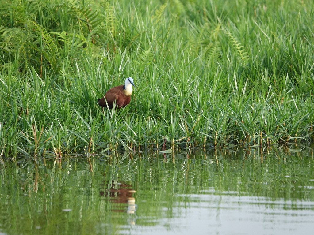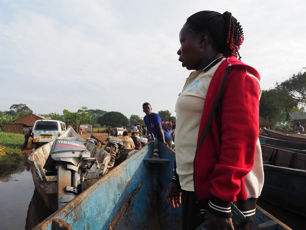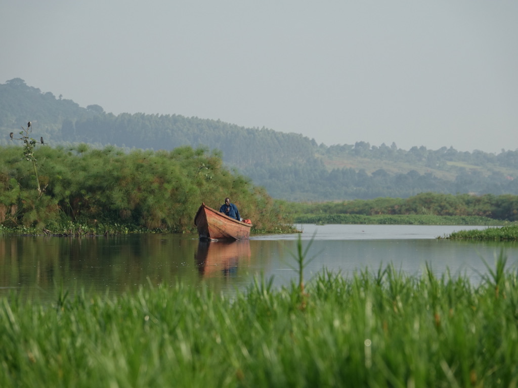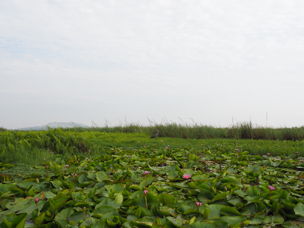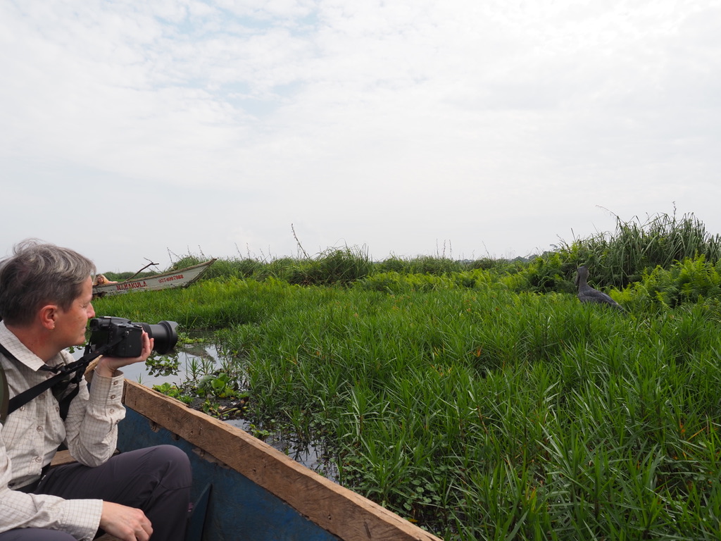 Après le petit-déjeuner, nous prenons la route pour le marais de Mabamba, à la recherche du bec-en-sabot. Le marais de Mabamba borde le lac Victoria, à l’ouest d’Entebbe. C’est une zone importante pour la conservation des oiseaux de l’Ouganda (RAMSAR). Il faut une bonne heure pour parcourir les 40 km de route, puis de piste qui conduisent au départ de l’excursion organisée par des villageois et pêcheurs. Maria sera notre guide, sa première question est « What is your target ? – Shoebill of course ! »
