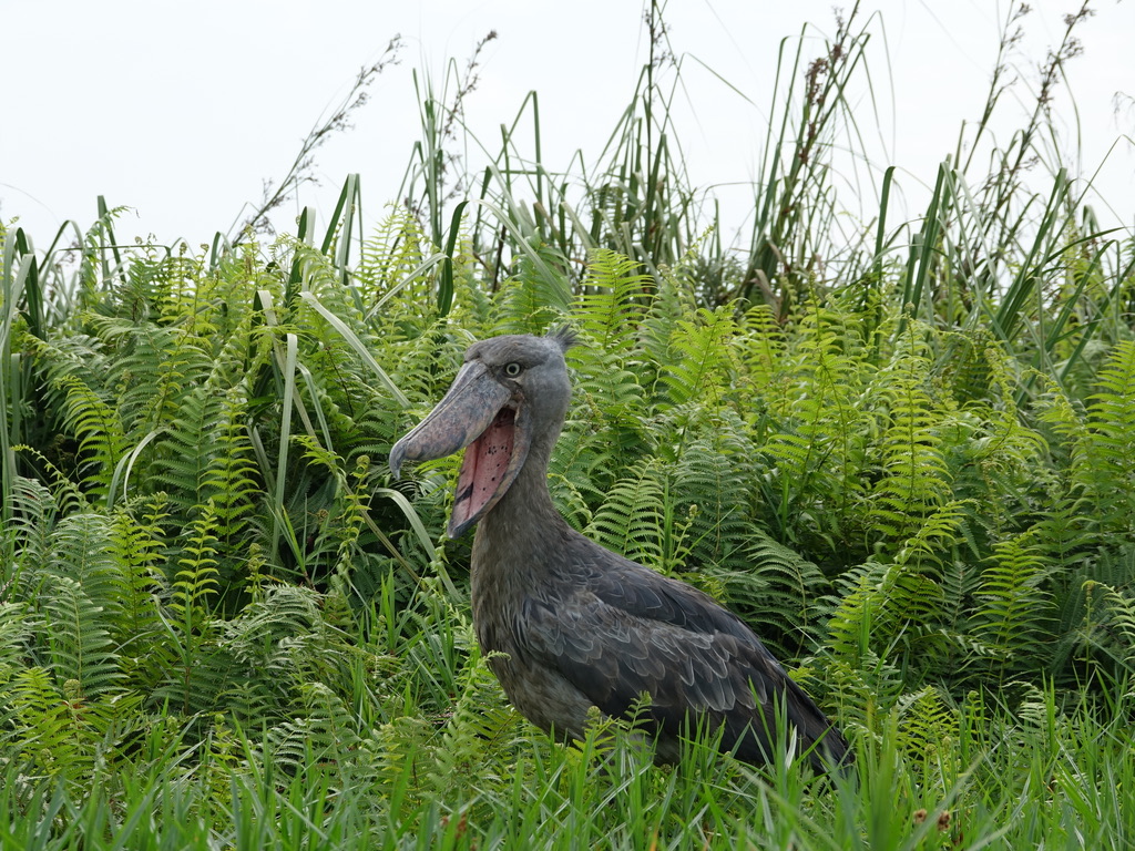 Le matin est le meilleur moment de la journée pour observer le shoebill. Il chasse à l’affût – d’où ce regard fixe – et se déplace furtivement pour mieux surprendre ses proies. Il se nourrit de poissons, serpents et grenouilles, qu’il tue avec son crochet.