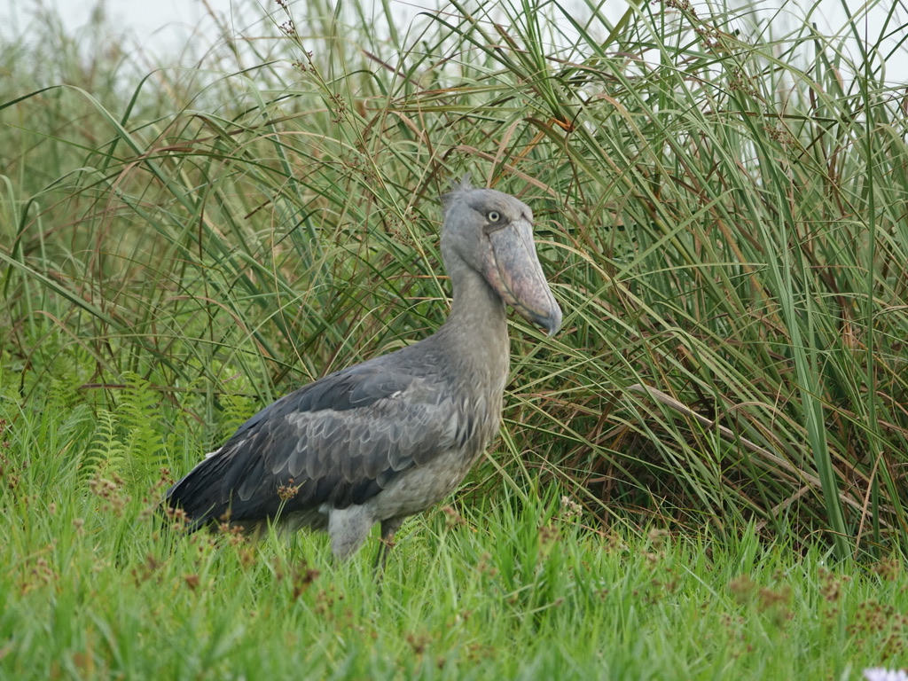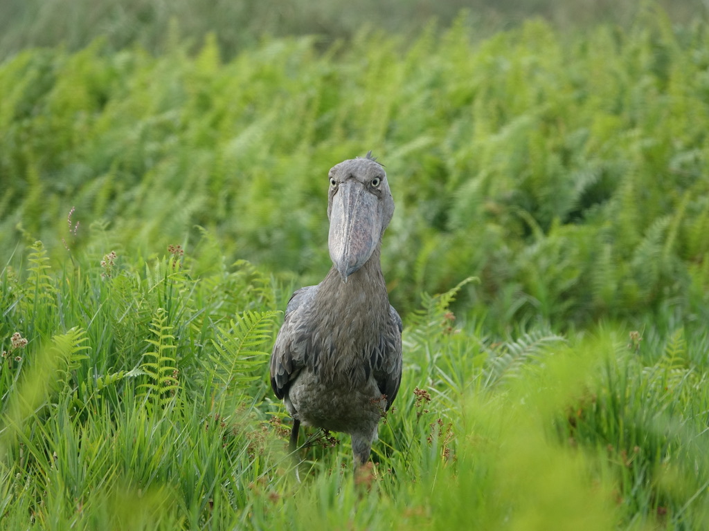 Notre shoebill est assez peu farouche. Il s’est approché à moins de 4 mètres de notre barque et nous a accordé un long moment. Il n’a pas hésité pas à croiser le regard.