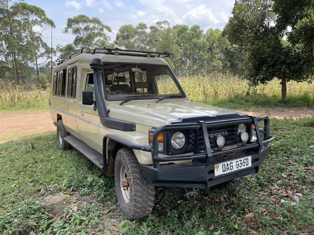 Une longue route va nous mener jusqu’à notre seconde étape, Kibale. L’occasion pour moi de vous présenter la bagnole comme l’appelle David. Une Toyota Land Cruiser 7 places immense…