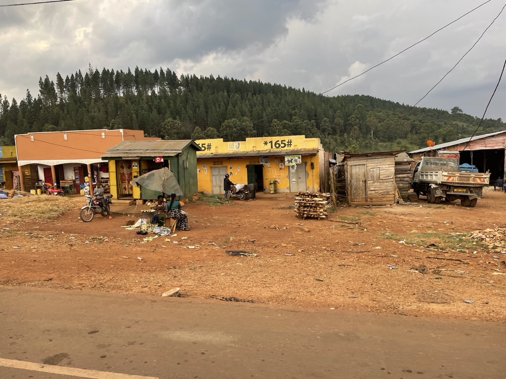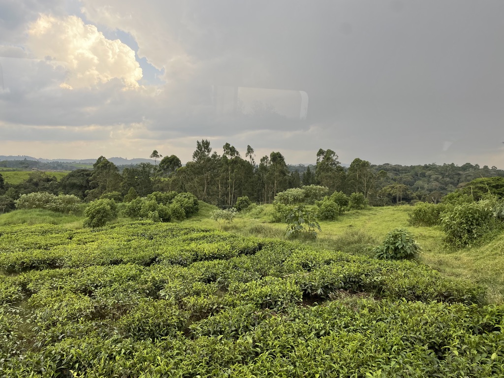 Seconde étape : Kibale à environ 5h de route d’Entebbe. Cette première longue route nous met en contact avec le pays, notamment avec les « centres commerciaux » animés par les artisans et petits commerçants à chaque carrefour. Les paysages changent à mesure que l’altitude augmente, nous passons devant des plantations mêlées de maïs, banane et café. Des forêts d’eucalyptus sont exploitées pour leur pousse rapide. Sur le plateau, vers 1200 – 1300 mètres, commencent les plantations de thé.