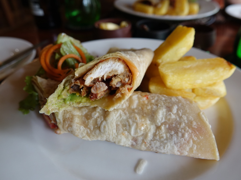 Nous avons très bien mangé au Primate lodge. Le menu du premier soir : soupe carotte gingembre bien relevée, filet de boeuf et crêpes Suzette. A midi : soupe de pomme de terre et un excellent wrap poulet avocat tomate.