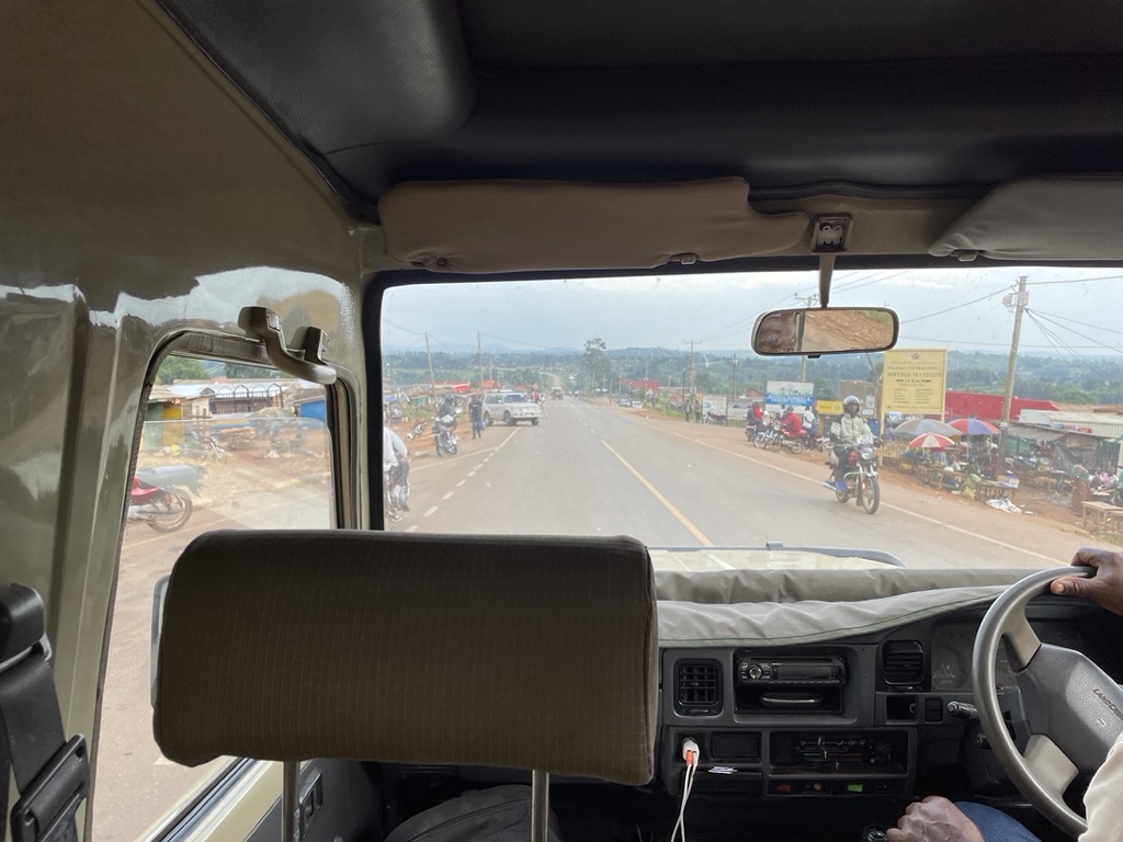 Une expérience surréaliste se produit. David nous montre la forêt de Kibale et nous explique que nous contournons le parc national par le nord, nous sommes vers Sebitoli. Je lui parle alors d’une chercheuse française, Sabrina Krieff, qui y travaille et dont j’ai lu un livre (voir dans l’article Trek aux chimpanzés). Deux personnes marchent le long de la route, je les reconnait immédiatement. Ce sont Sabrina et Jean-Michel Krieff ! Nous les avons pris à bord et conduit quelques kilomètres plus loin. Quel hasard incroyable !