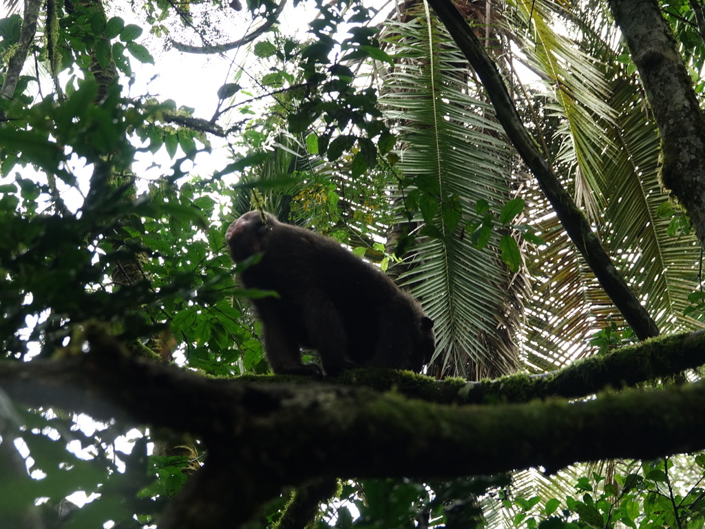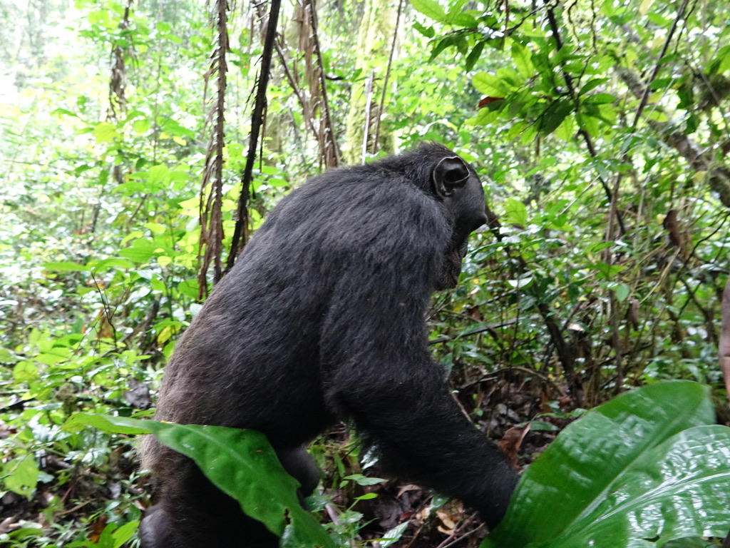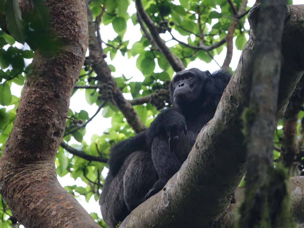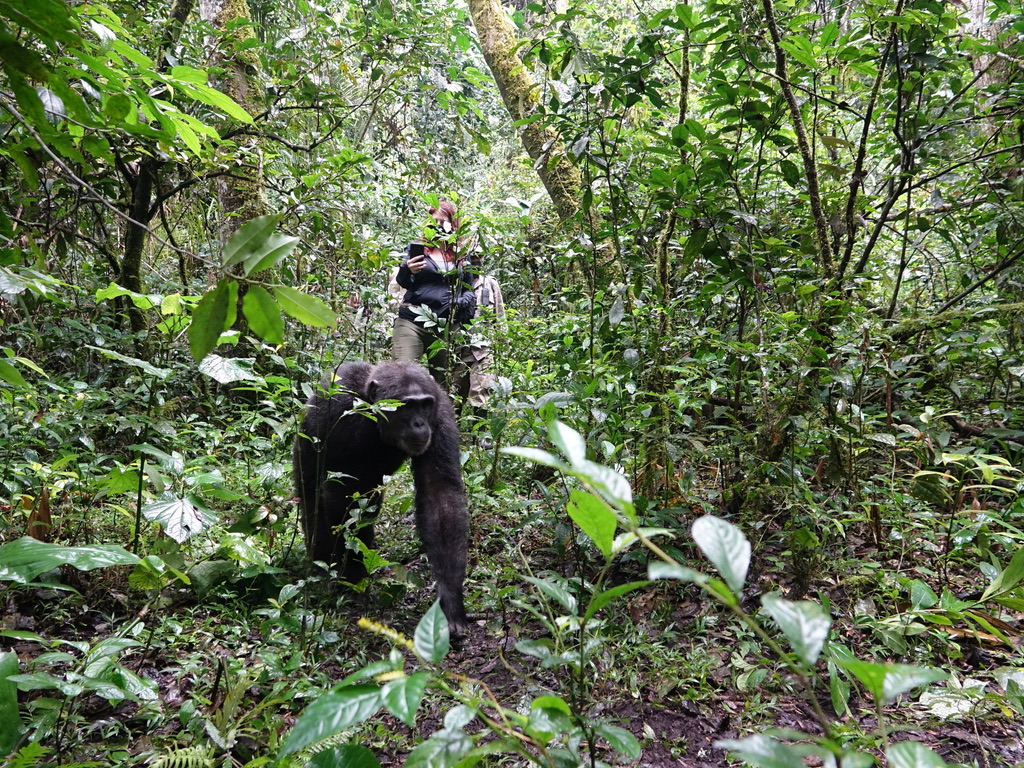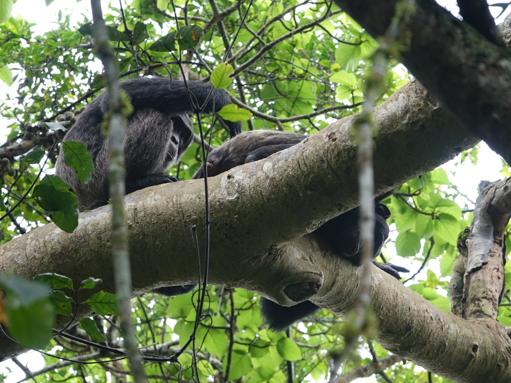 Un seul groupe de chimpanzés est localisé, tous les groupes d’humains se rejoignent et nous passons une heure en leur compagnie. La règle stipule une distance de 8 mètres minimum. Comme ils sont restés dans les arbres, nous étions à une bonne dizaine de mètres !