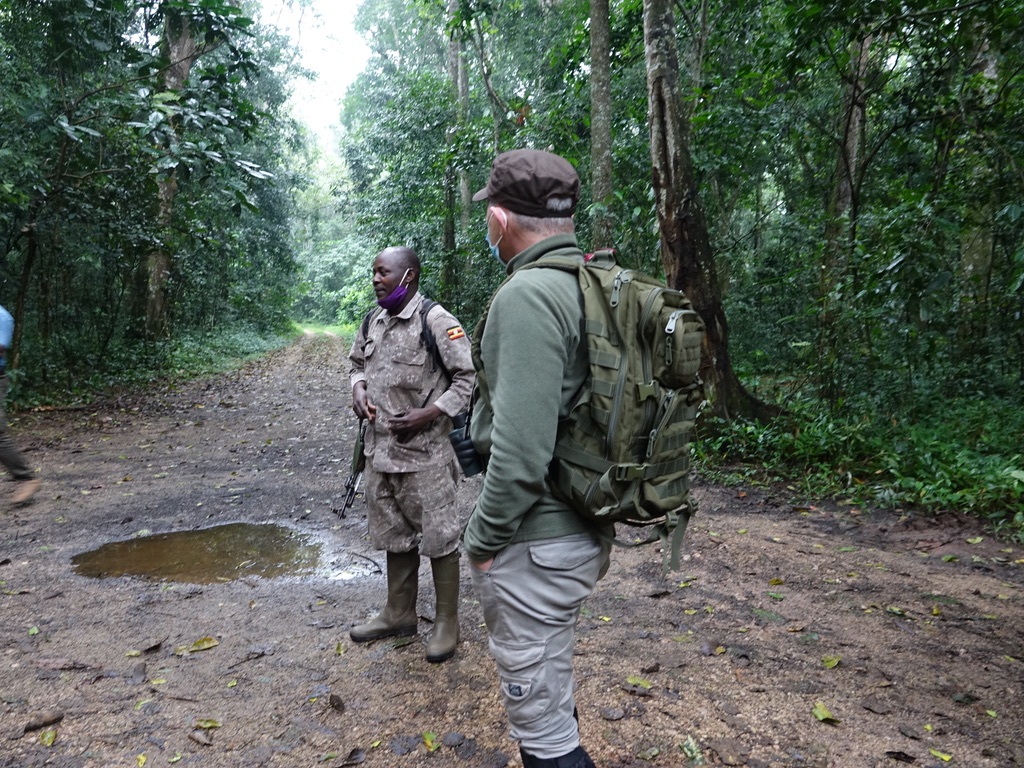 Nous sommes accompagnés par Justice, ranger de la réserve de Kibale. Le plan est de chercher les chimpanzés au moment de leur réveil, quand ils descendent des arbres où ils ont passé la nuit.