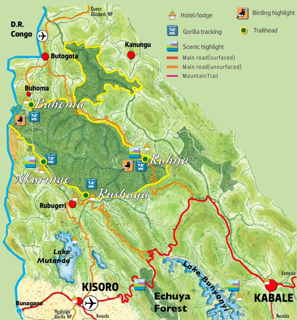 En route vers notre quatrième étape, sans doute le point d’orgue de ce voyage : le Parc National de la Forêt Impénétrable de Bwindi, qui abrite les Gorilles des montagnes (environ 4h de route depuis Ishasha).