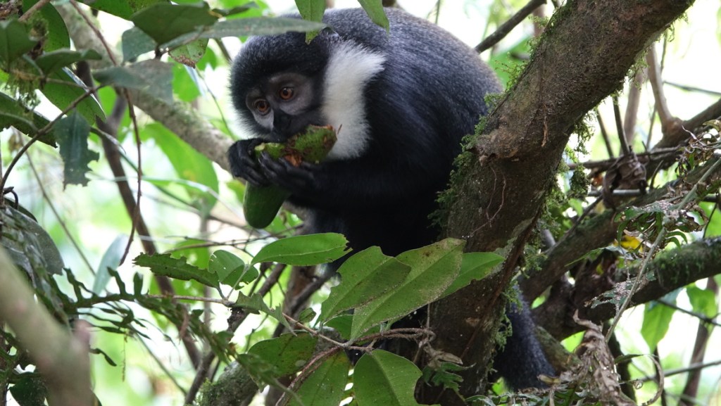 Encore des marches mais une jolie vue sur la canopée qui nous offert quelques belles photos depuis la terrasse et un nouveau singe à observer : L’Hoest Monkey ou singe des montagnes.
