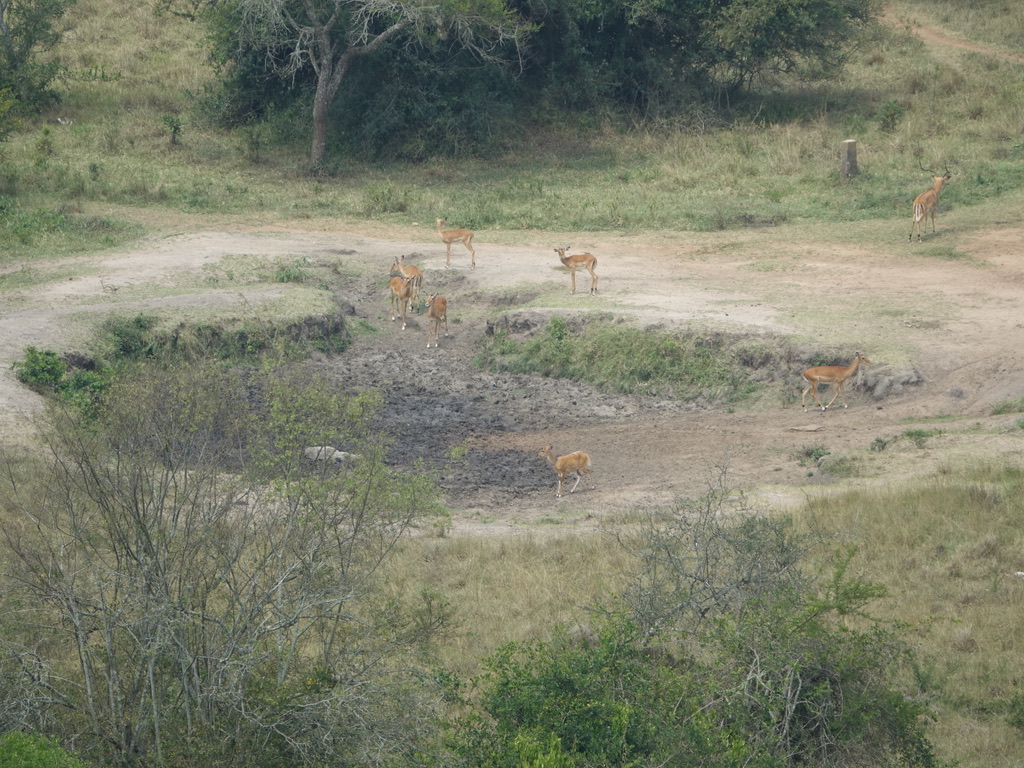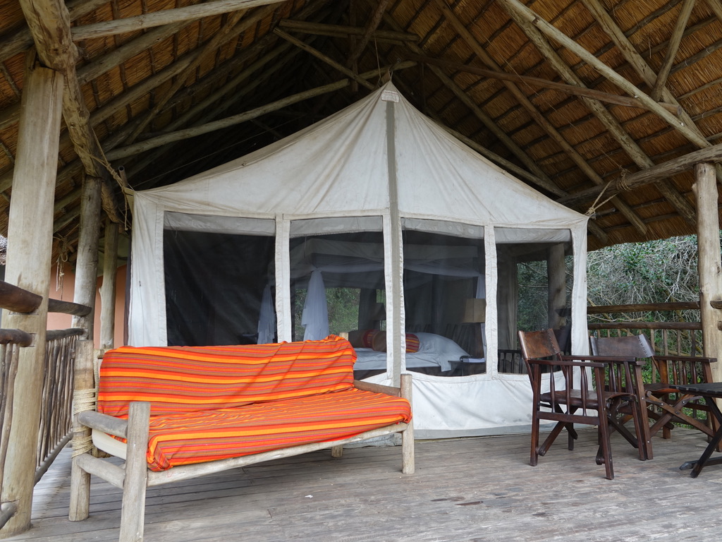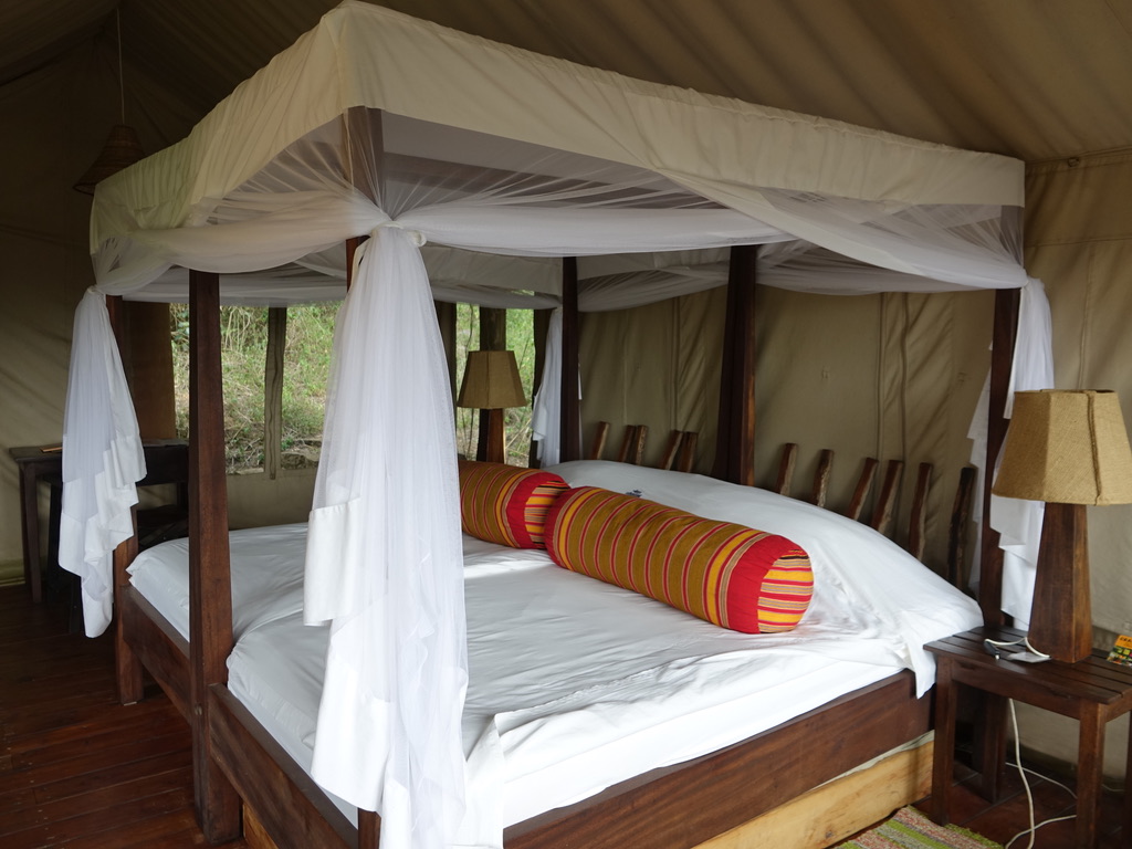 Les 12 tentes bénéficient d’une grande intimité et donne le sentiment d’être seul au milieu du bush. Nous en occuperons deux : la tente Waterhole pour commencer, avec une très belle vue sur le point d’eau mais très loin des parties communes et de nombreuses marches. Comme mes jambes sont lourdes du trek aux gorilles et que cela doit se voir, l’équipe nous déménage le lendemain dans la tente Klipspringer côté coucher de soleil. Les salles de bain avec vue sont géniales !