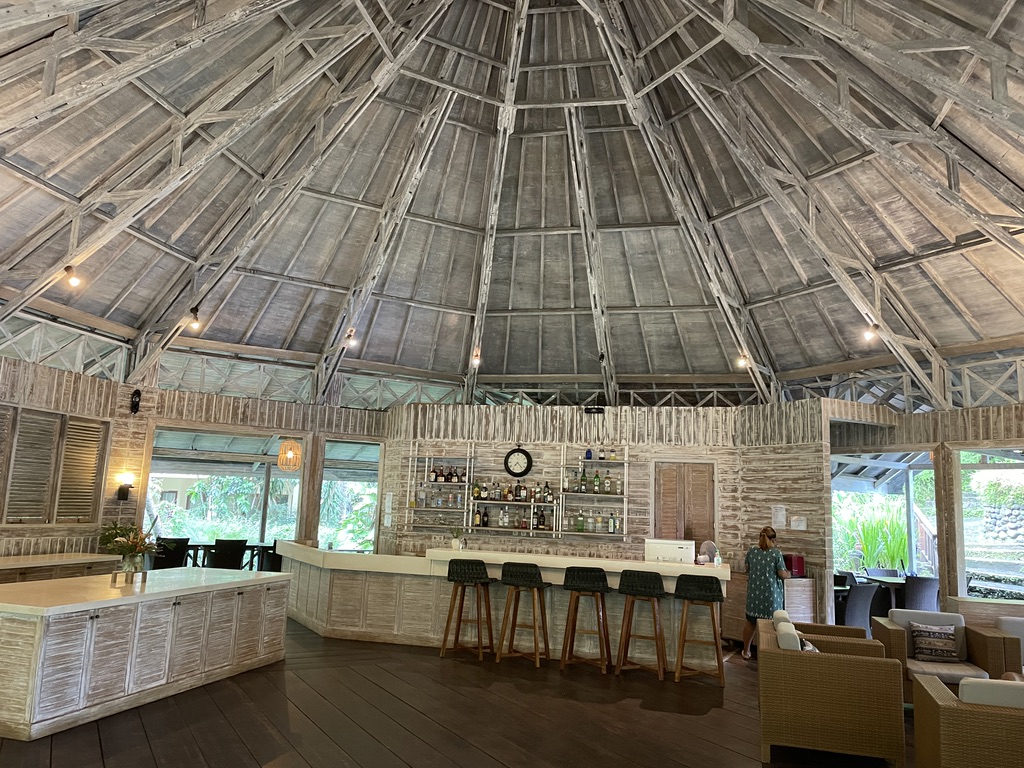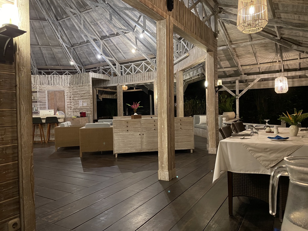 Le restaurant est à l’étage, niché dans les grands arbres, juste derrière la piscine.