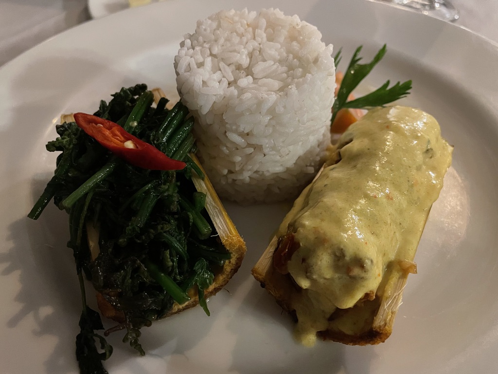 Au déjeuner comme au dîner, un menu 4 plats est proposé : soupe pour commencer, puis une entrée froide, un plat chaud et un dessert fait maison. Les menus changent tous les jours, les plats sont occidentaux ou indonésiens. Il y a toujours 3 ou 4 choix pour le plat principale, avec à minima une option sans épices. Nous nous sommes régalés !