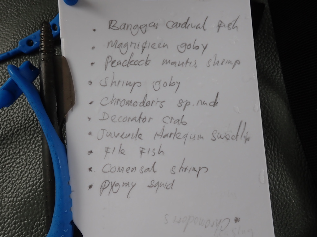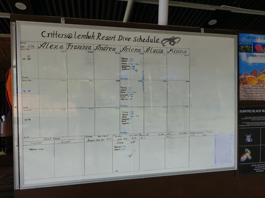 Nous plongeons avec Rei, qui écrit sur une ardoise magique le nom de la créature qu’il nous montre, puis fait un récapitulatif en fin de plongée. Il n’y a plus qu’à photographier sa plaquette pour identifier facilement les bestioles rencontrées pendant la plongée.