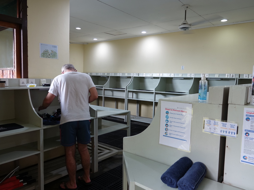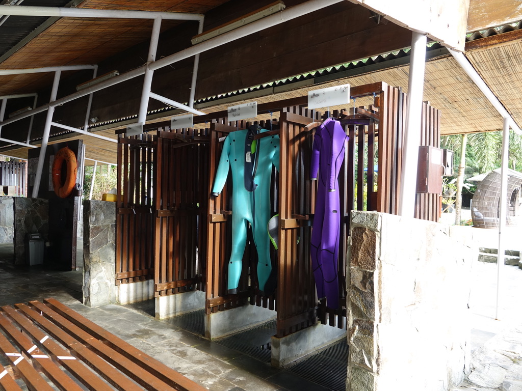 Chaque plongeur dispose de son propre vestiaire, très fonctionnel, avec des patères pour faire sécher le gilet, les chaussons et palmes, des cintres pour la combinaison.