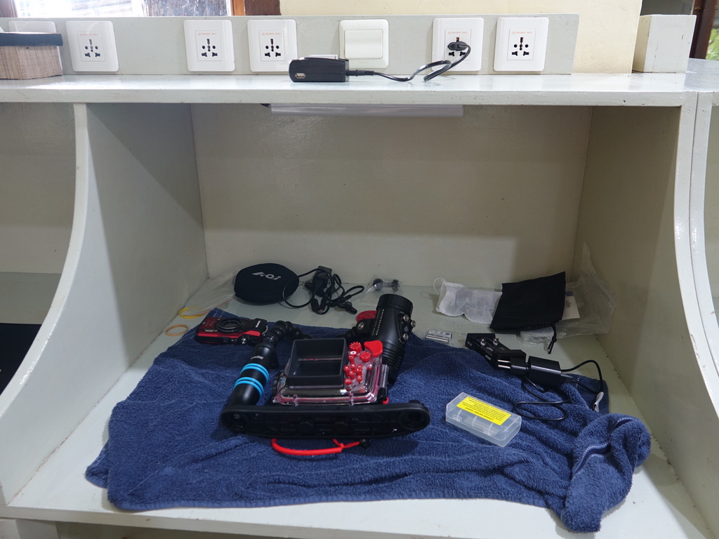 La spacieuse salle de photo est l’endroit idéal pour installer son matériel photo. Des postes de travail privés avec des prises de courant sont disponibles. A l’extérieur, il y a des bacs de rinçage et un pistolet à air comprimé pour éliminer l’eau de son boîtier après le rinçage !