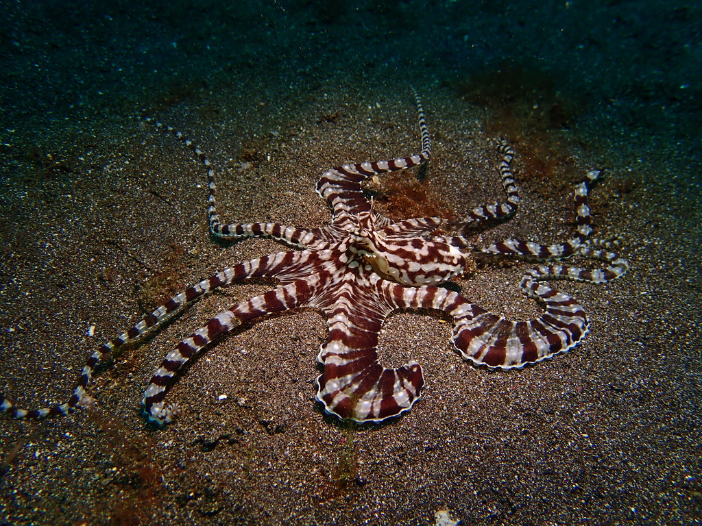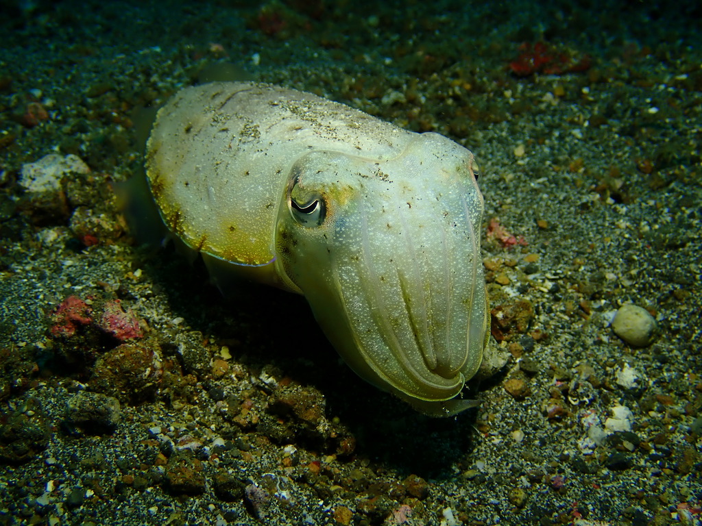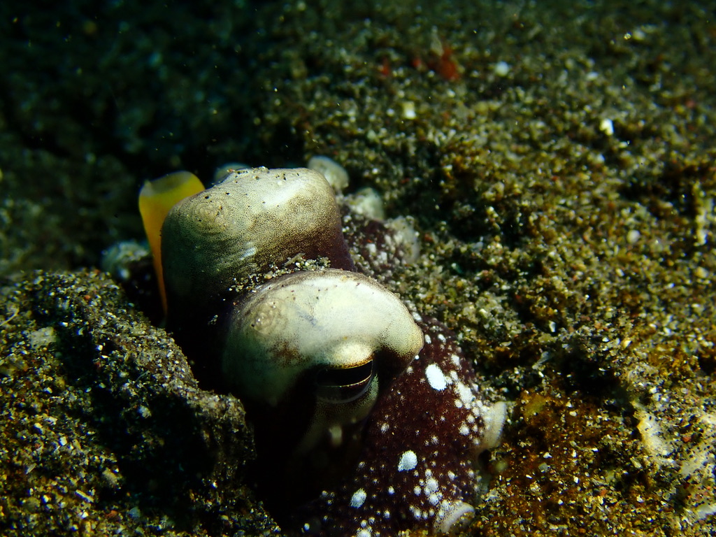 Une des vedettes du détroit de Lembeh est le Coconut Octopus, qui aime se cacher dans le noix de coco, coquillages, bouteilles etc.. Celui-ci n’ayant rien trouvé pour nous échapper a tout simplement décider de s’enfouir dans le sable !