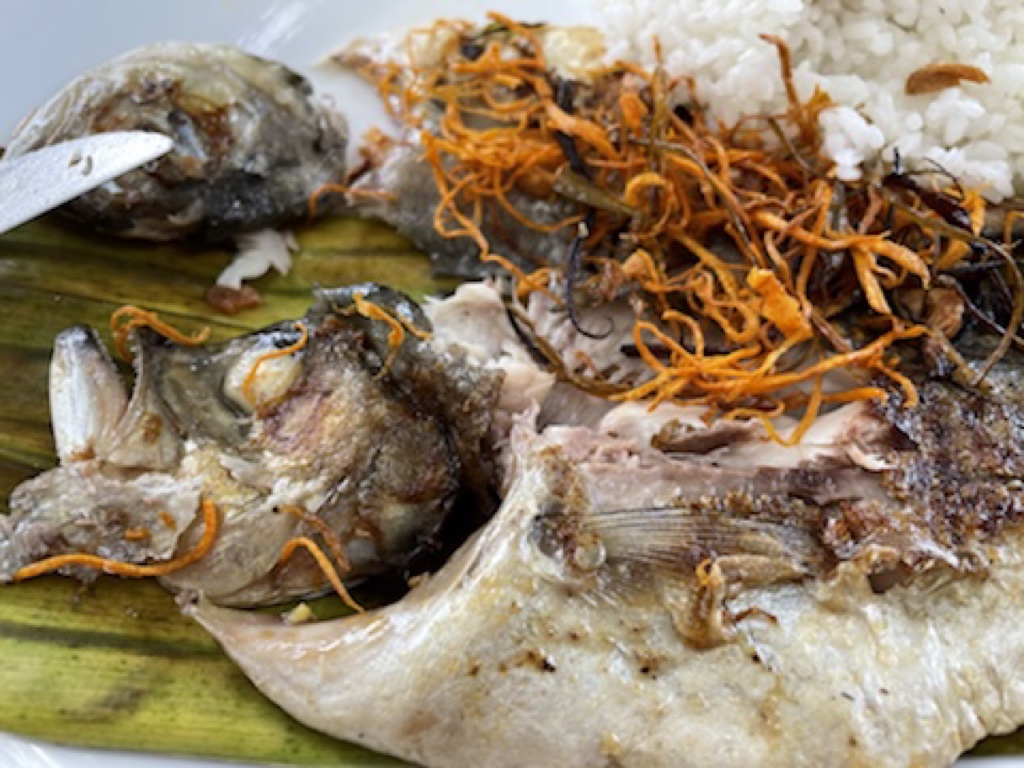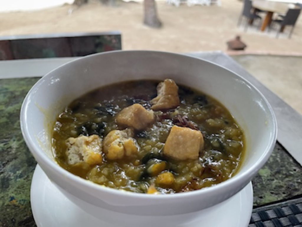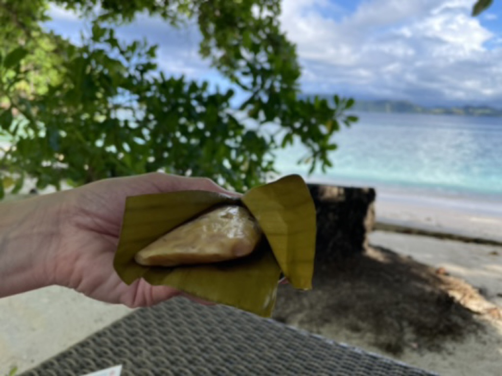 Plus de buffet au restaurant mais une carte entrée + plat + dessert. On passe sa commande chaque soir. Les plats locaux – Nasi goreng, Boeuf Rendang, Bubur Manado – sont authentiques, le poisson du jour sort de l’eau et des plats occidentaux (pâtes, burgers) sont au menu. C’est un peu court côté dessert, mais l’apple jackfruit crumble est un délice. Les snacks sont locaux, comme ce gâteau à la banane cuit à la vapeur dans une feuille de bananier.