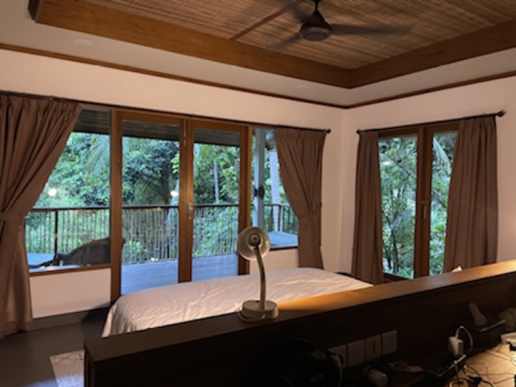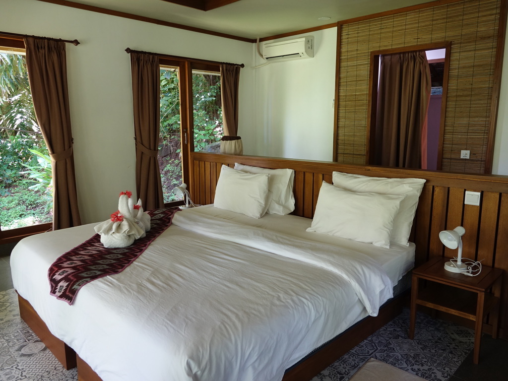 Nous sommes logés dans une hillside room, sous les arbres, avec une grande terrasse et tout le confort.
