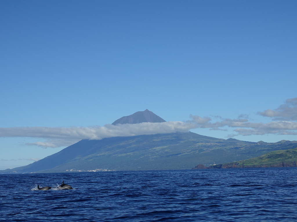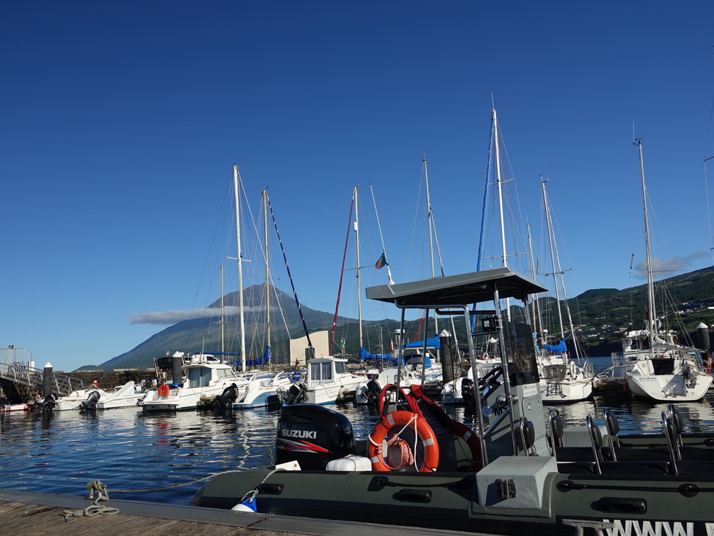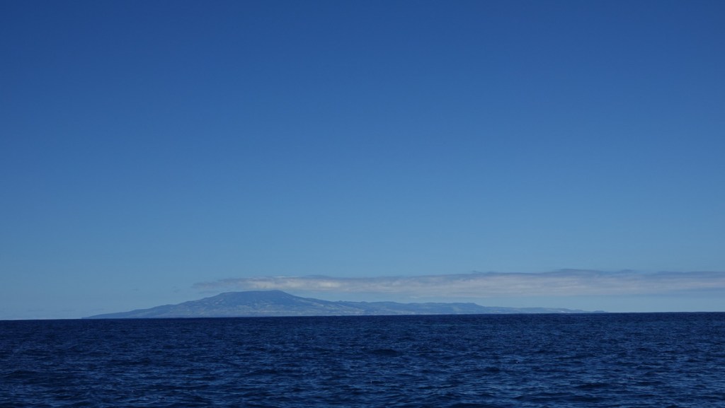 Nous reprenons la direction de Pico, avec un arrêt au large pour embrasser du regard les 5 îles du groupe central : Pico, São Jorge, Faial, Terceiras et Graciosa. Un moment rare, habituellement réservé aux courageux qui font l’ascension du volcan. Aujourd’hui, le ciel est sans nuage (ou si peu) !