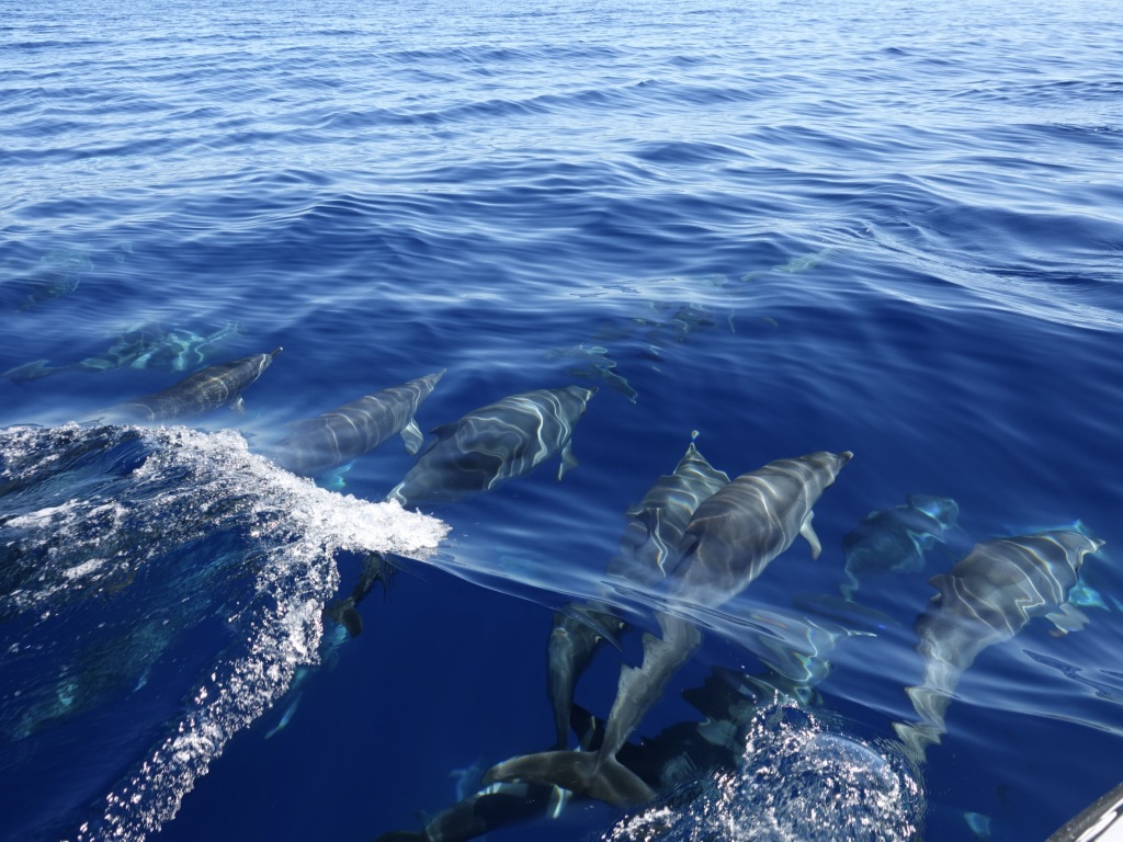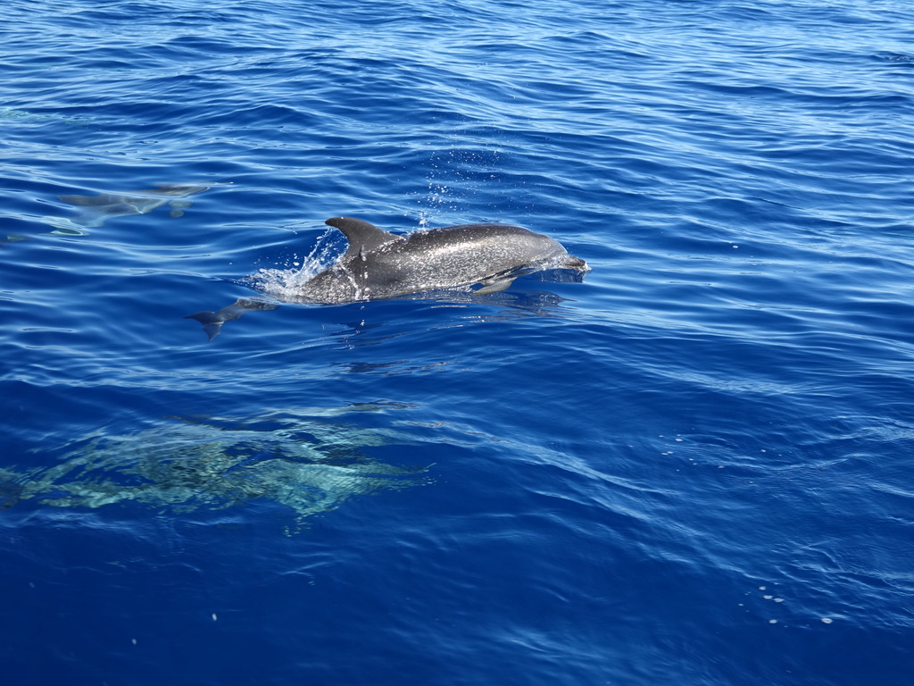 Le festival se poursuit avec une bande de grands dauphins exubérants. Ils foncent tout autour de nous, sous l’étrave. L’eau est tellement claire que la photo depuis le bateau est nette ! Leur énergie est communicative, nous sommes tous joyeux à bord. Un peu plus tard, c’est le tour des dauphins tachetés.