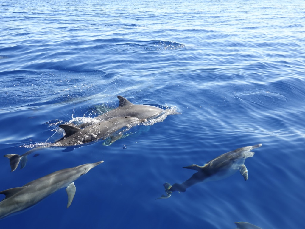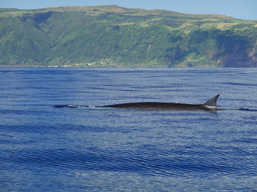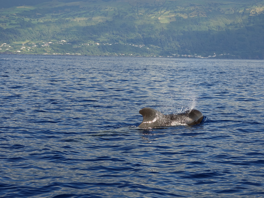 Nous ajoutons à notre liste le Dauphin commun, qui ne l’est pas aux Açores où il fait face en été à la concurrence des dauphins tachetés. C’est un très joli dauphin, bleu, blanc et jaune.