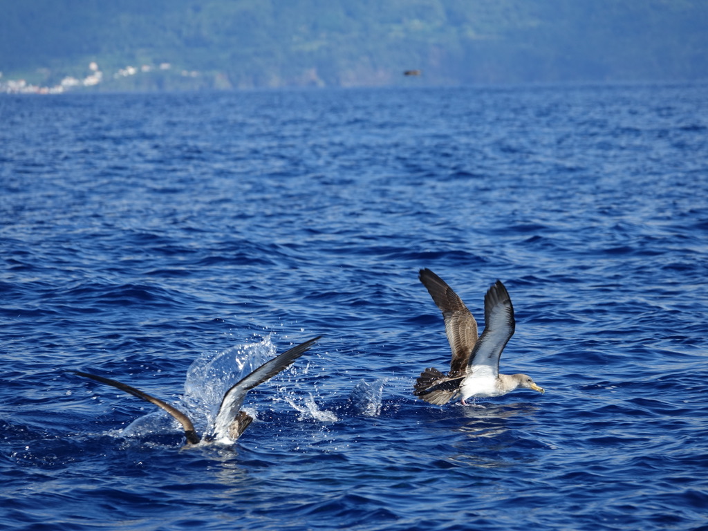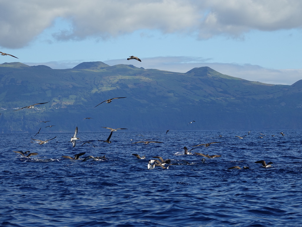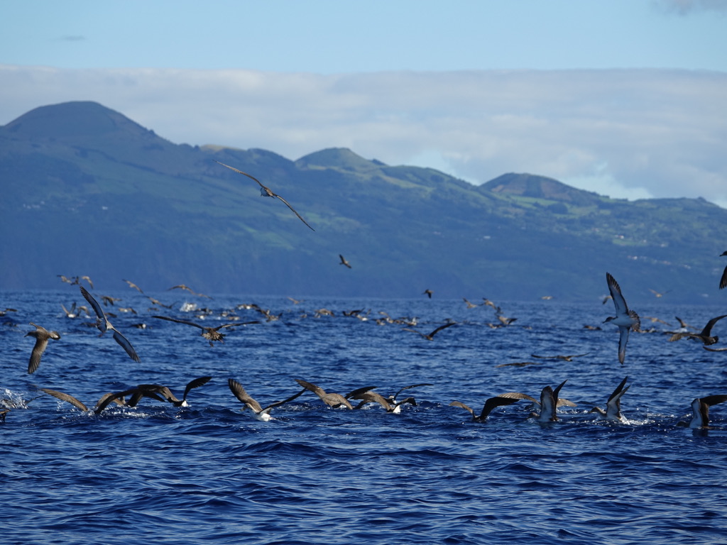 De nombreux puffins cendrés chassent, quelques dauphins et probablement des thons se mèlent au festin. C’est plutôt spectaculaire.