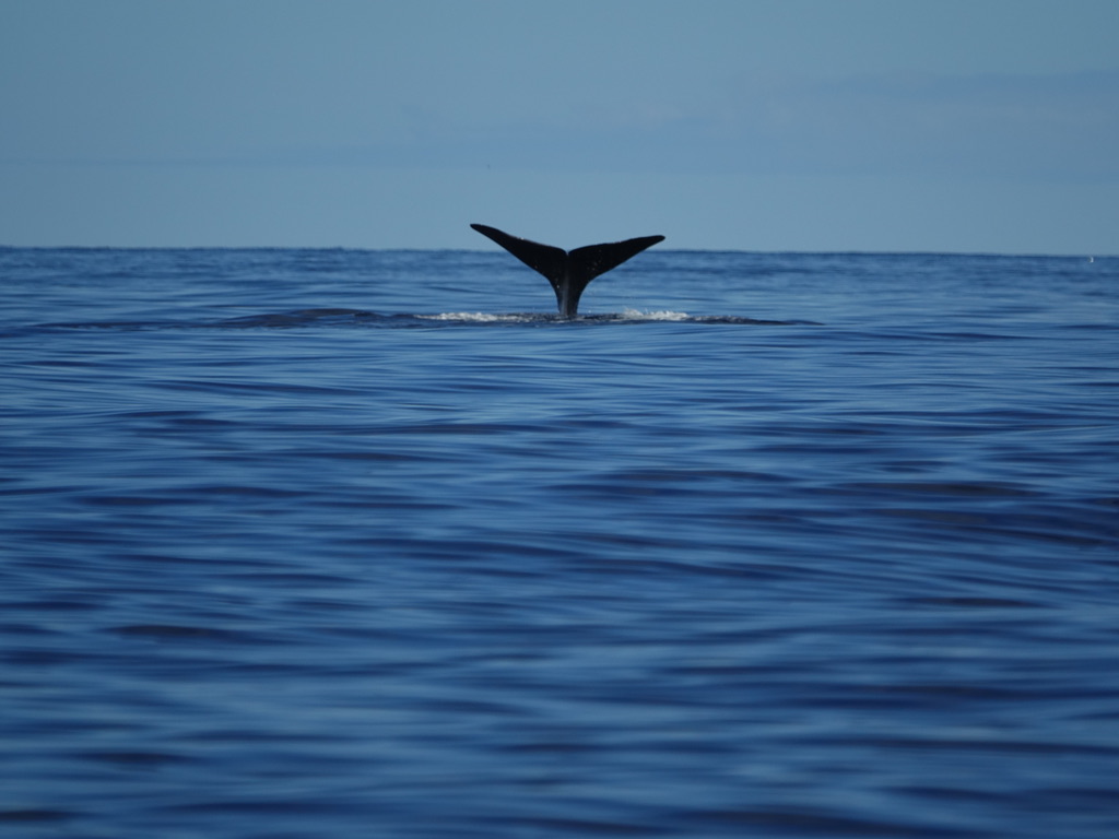 Pour finir en beauté, nous tombons sur une famille de cachalots. En fait, notre bateau a effrayé un jeune. Il appelle à l’aide en émettant des clics, sa mère (ou une autre femelle) le rejoint et nage à ses côtés. Quelques chants se font entendre. L’un d’entre eux plonge et nous offre cette belle nageoire caudale.