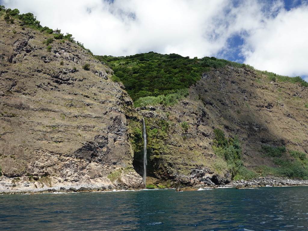 Notre navigation nous mène au pied des immenses falaises de la côte sud de São Jorge, d’où coulent des cascades impressionnantes (certaines sont sèches en été).