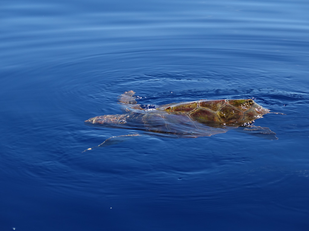 Nous poursuivons notre quête de cétacés et rencontrons une petite tortue caouanne. Elle voudrait bien plonger mais elle a pris trop d’air et elle est contrainte de nous supporter 😉