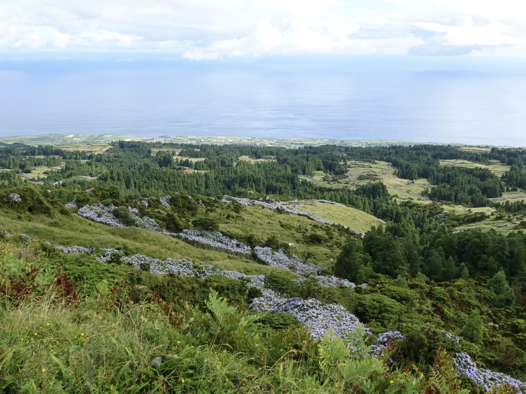 Elle est surnommée l’île bleue en raison des hortensias qui fleurissent de fin mai à fin août. Les portugais ont introduit les hortensias depuis l’Asie. Le climat leur convient et les hortensias des Açores sont de grande taille. Elles bordent les routes, comme celle qui conduit à la caldeira et servent même de clôture entre les champs !