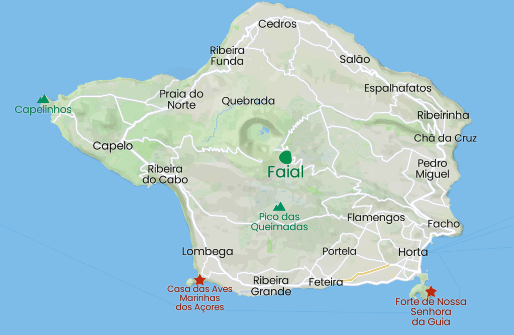 Faial fait partie du groupe central et constitue, avec São Jorge et Pico, les « îles du triangle ». Faial est une petite île (173,1 km2) plutôt peuplée puisque c’est la troisième île de l’archipel avec 14 994 habitants.