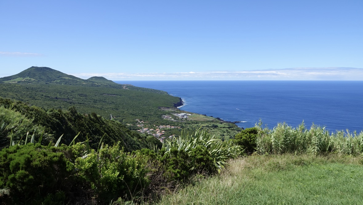 C’est reparti avec un arrêt au Miradouro da Ribeira das Cabras, pour découvrir le Fajã de Praia do Norte. Le Fajã résulte d’éboulis au pied d’une falaise côtière, causés ici par une coulée de lave. La bande de terre plate est évidemment fertile.