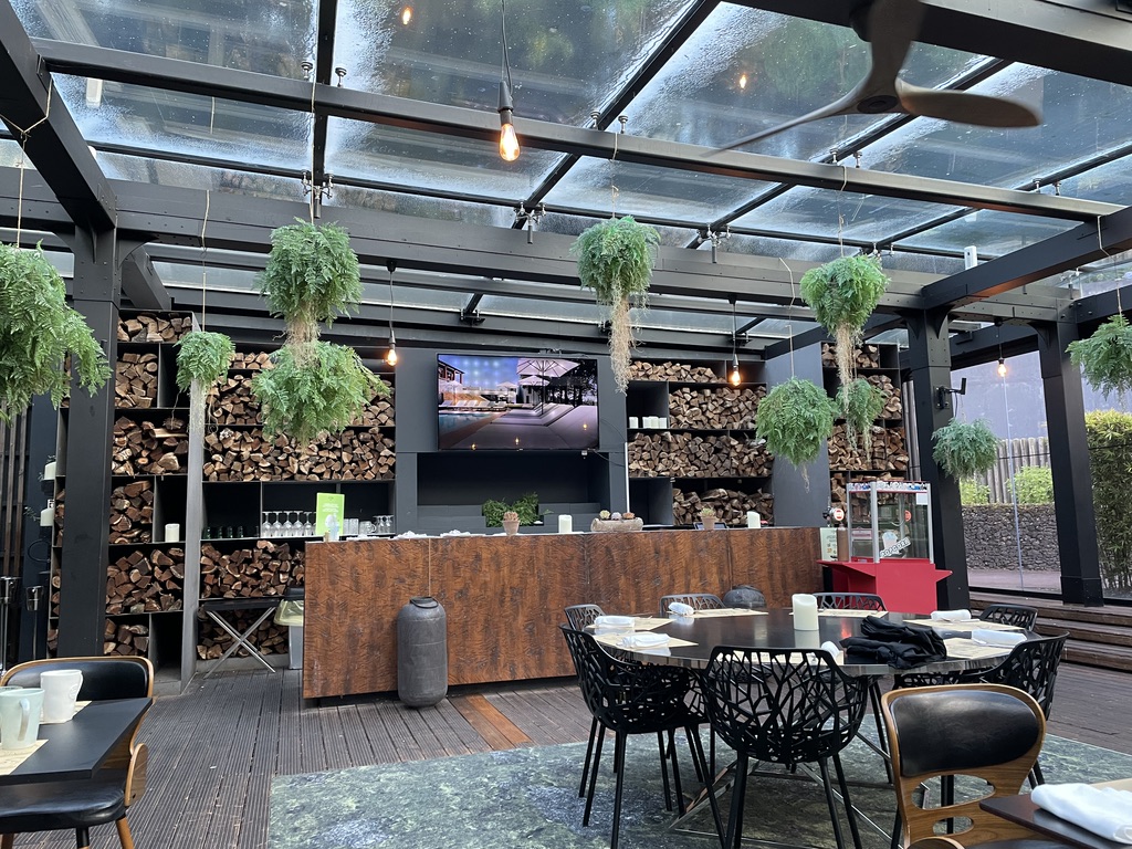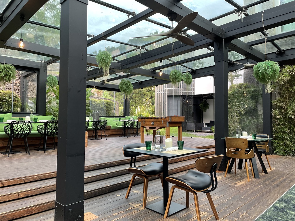 La salle de restaurant est une grande terrasse couverte, à la décoration tendance industrielle, ascendant nature !