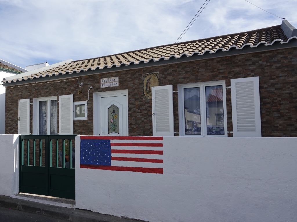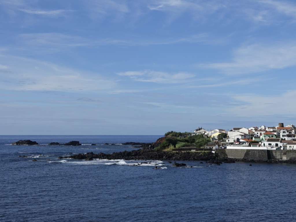L’étape suivante sur la route est le charmant village de Mosteiros, que nous avions aperçu depuis la caldeira, puis depuis le Miradouro da Ponta do Escalvado. La plage de sable noir et les îlots au large offre un paysage qui tranche avec le vert des montagnes et le blanc des petites maisons.