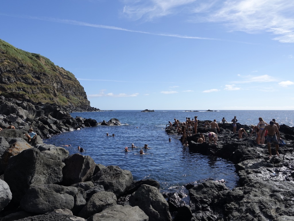 Le site de Ponta da Ferraria est une des curiosités volcaniques à São Miguel. Des sources d’eau chaude jaillissent dans une crique, garantissant une température très agréable (entre 24 et 34° selon la hauteur de l’eau). La piscine naturelle attire évidemment beaucoup de monde, mais cela reste une expérience ! Les aménagements sont parfaits : parking, douches et WC, cabines pour se changer et surveillance par des maîtres-nageurs. Des cordages dans l’eau sécurisent les baigneurs