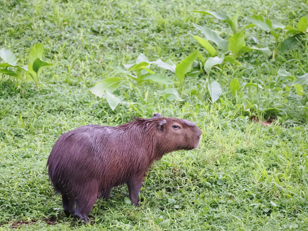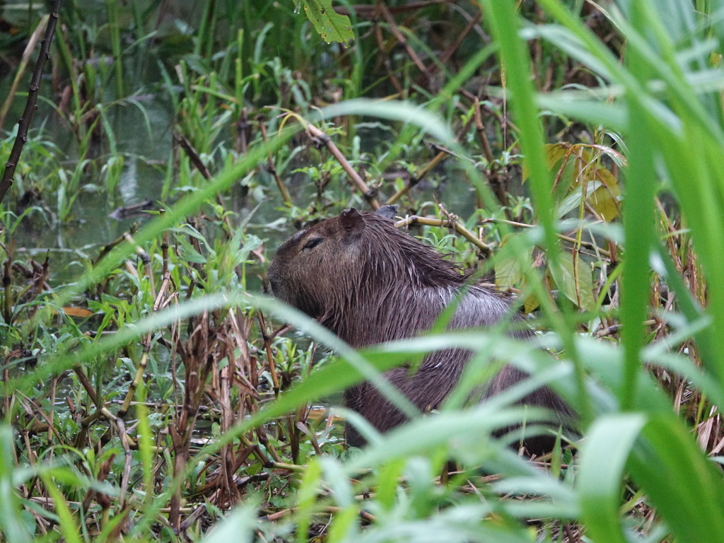 Ils nous emmènent au bord du canal, sur le spot d’Ammo Dump Ponds (6). Cela change de la forêt, nous sommes sur une toute petite zone, pourtant très riche. Nous avons la surprise de voir des capyaras. Ce sont des lesser capybara (Hydrochoerus isthmius) plus petits de ceux du bassin de l’Amazone.
