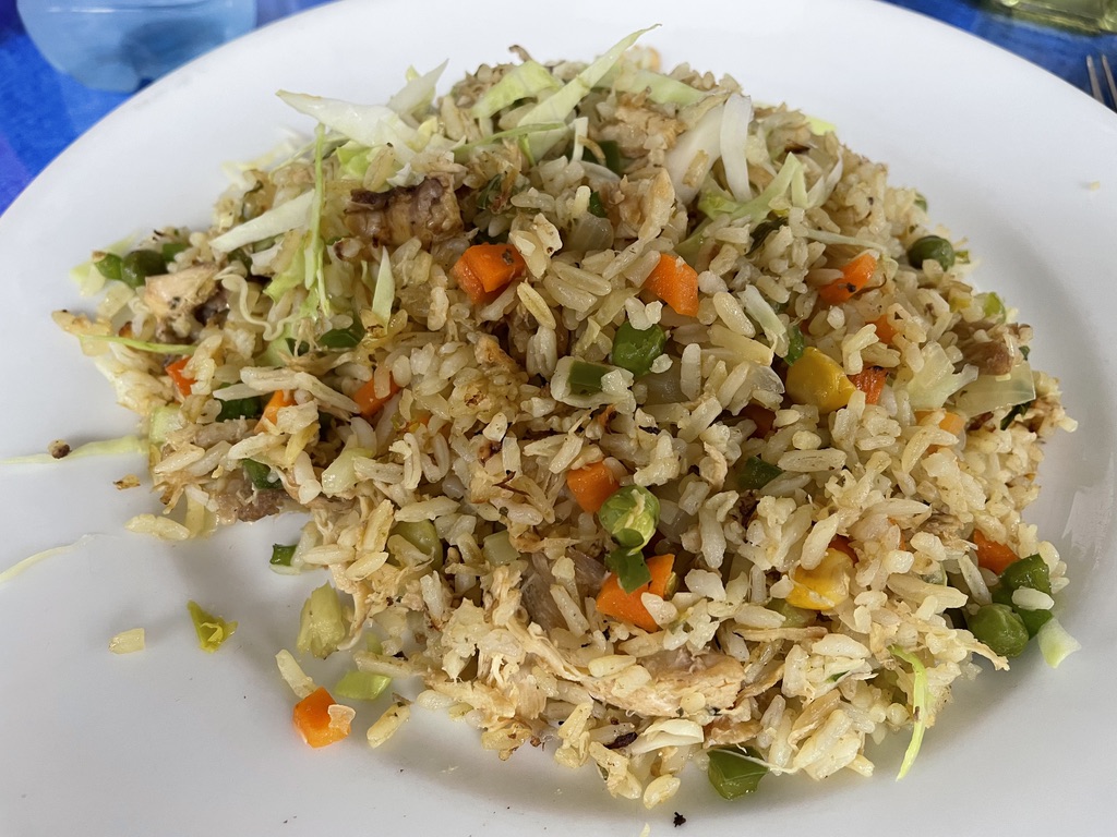 Pour notre premier repas le long de la route panaméricaine, , au restaurant Avicar, j’ai choisi un plat tout simple, arroz frito con pollo. Je crois que chaque famille panaméenne a sa recette. Ce plat est simple : du riz, du poulet effiloché, des cubes d’oignons, de carottes, chou et maïs pour celui-ci sans oublier les herbes aromatiques.