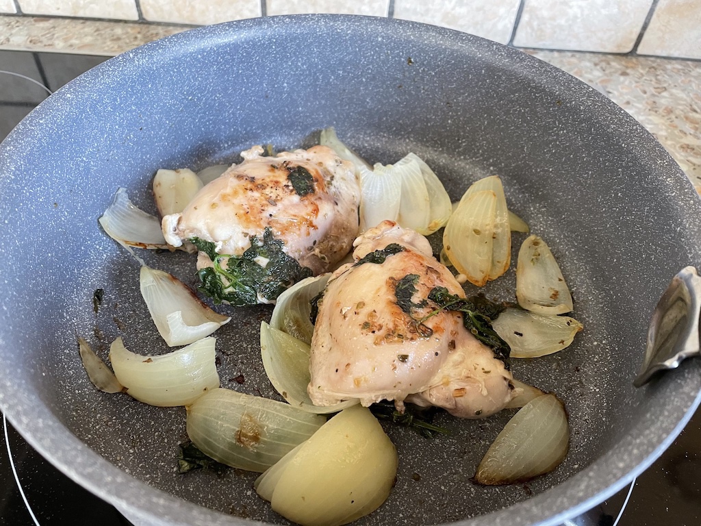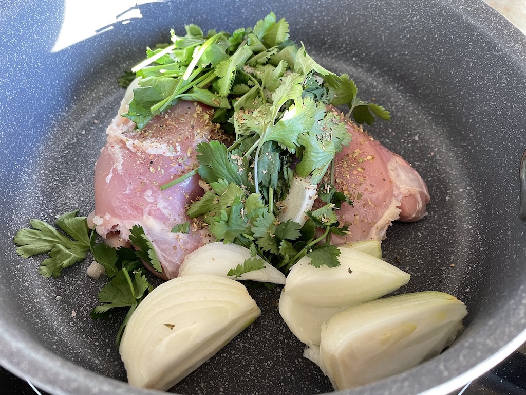 Mettre les morceaux de poulet dans un faitout avec l’oignon, de la coriandre et de l’origan, saler et poivrer. Couvrir et laisser cuire à feu doux sans matière grasse pendant 20′, en remuant fréquemment.
