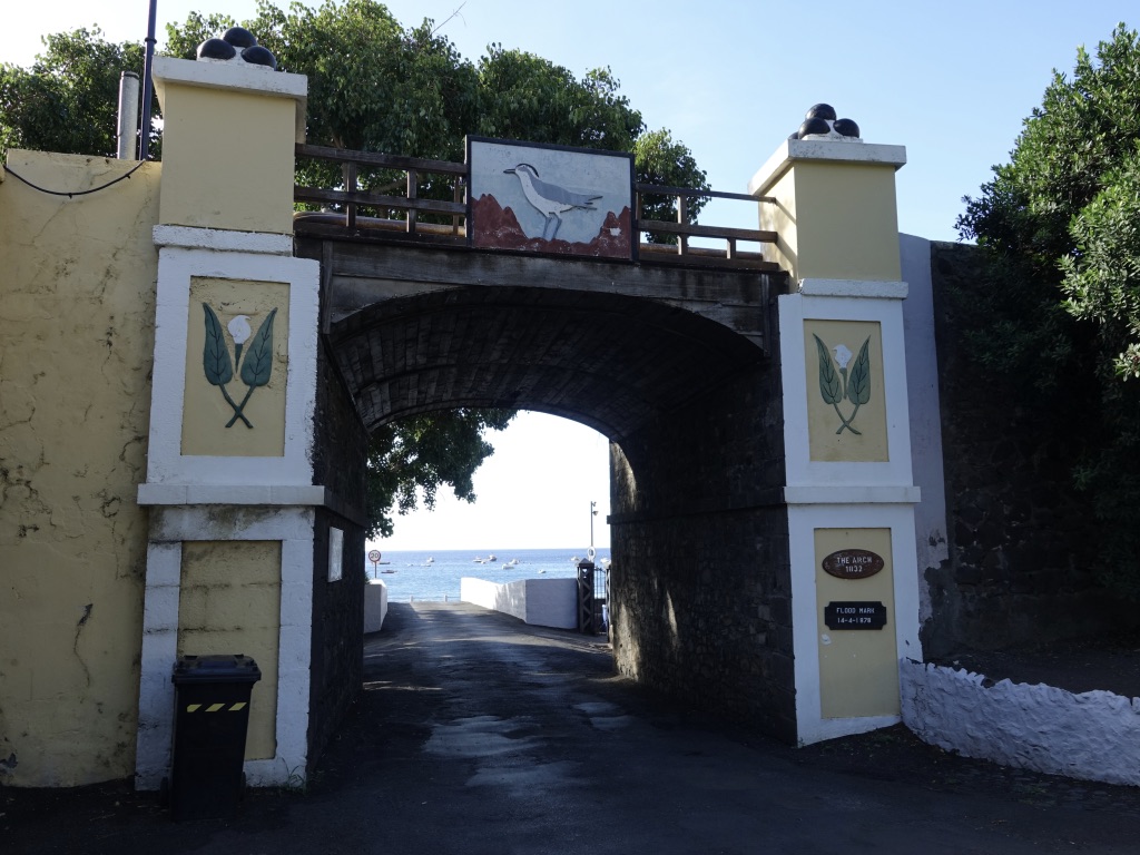 La visite commence par la porte de la ville, appelée simplement the Arch. Notez la représentation de l’oiseau endémique de l’île, le Wirebird. Montez par un escalier sur Castle Terrace pour la vue sur Grand Parade côté ville et le Wharf côté mer.