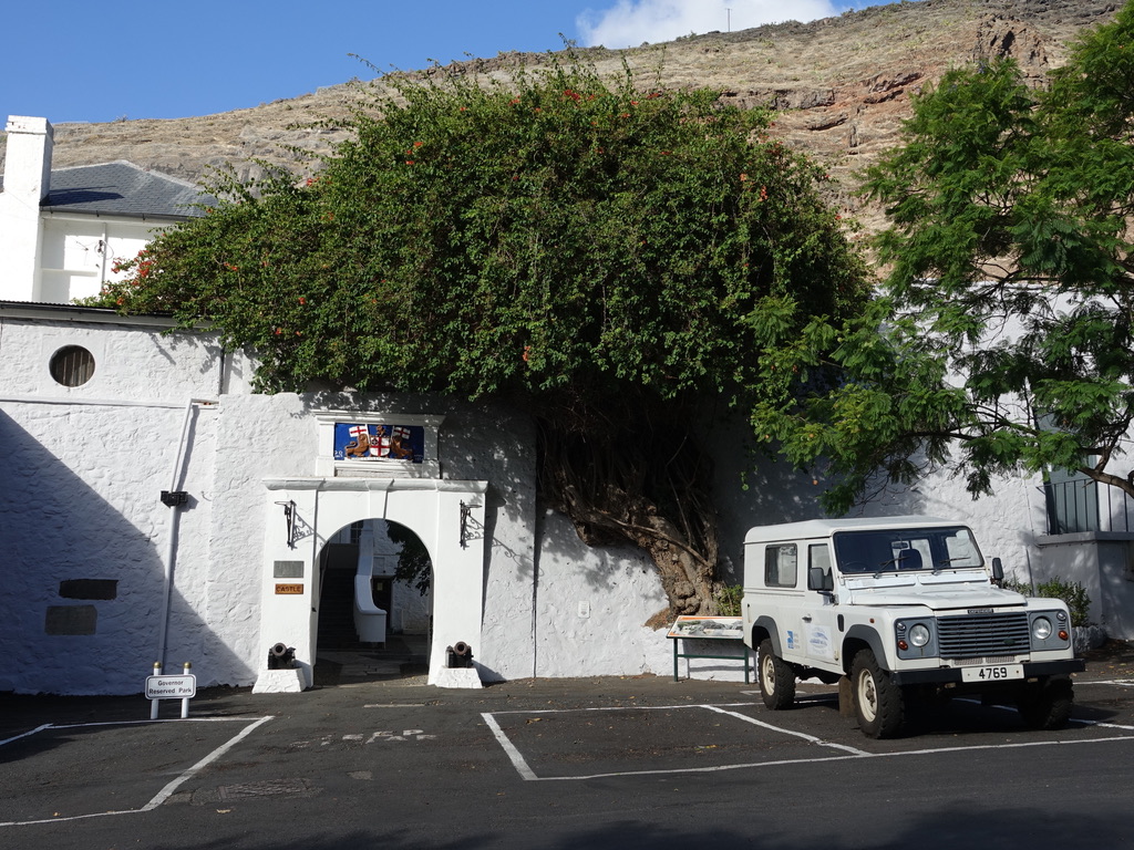Grand Parade était le terrain d’exercice de la garnison britannique. Aujourd’hui c’est le parking. Le château, la cour de justice, la bibliothèque, l’église anglicane et la prison se trouvent sur cette grande place. Le château abrite le gouvernement du territoire et arbore toujours les armoiries de l’East Indian Company. Notez le Land Rover garé juste devant, il y en a beaucoup sur l’île, so british.