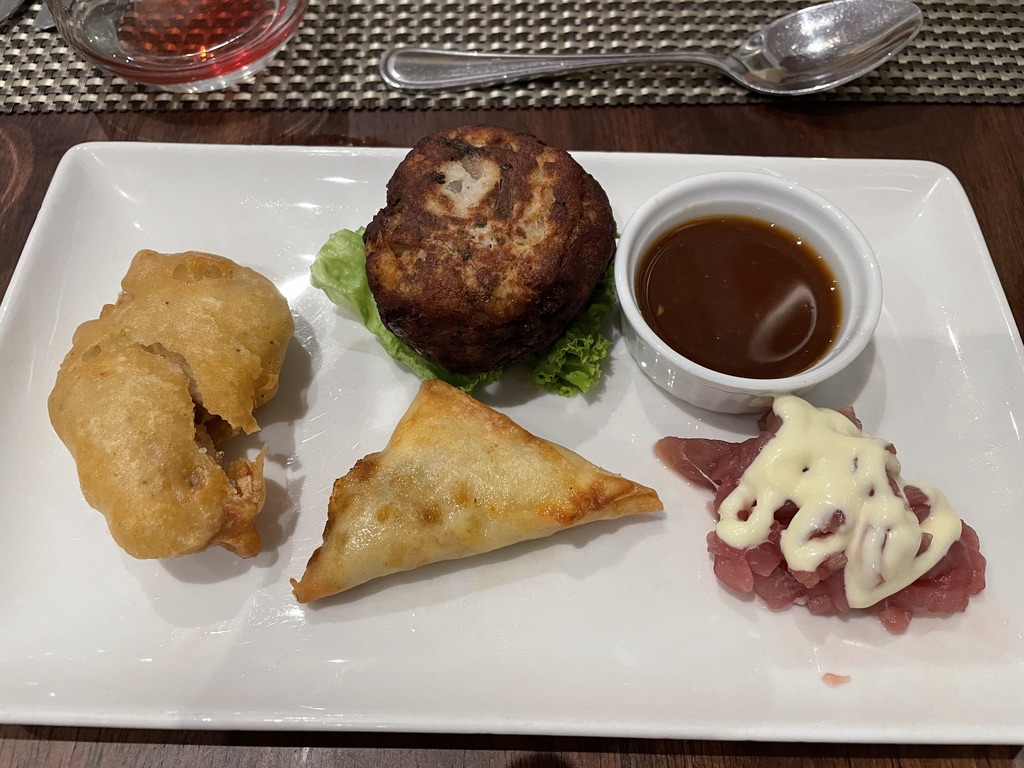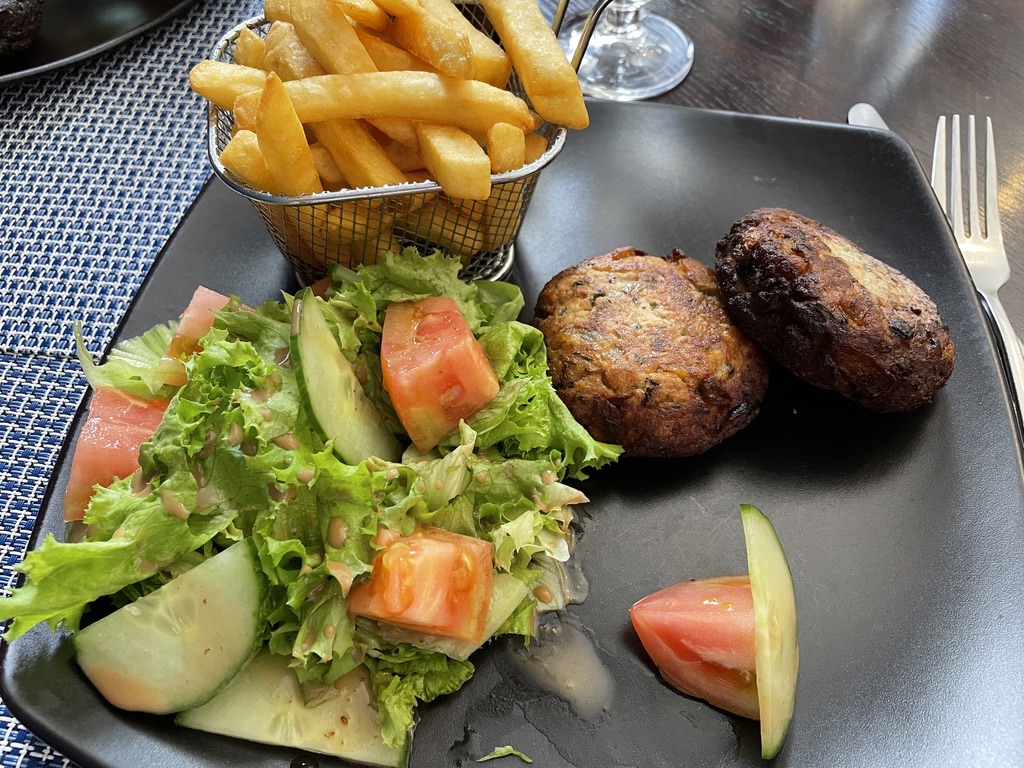 Nous en avons mangé un peu partout. Et même plusieurs fois au Mantis, servi avec des frites et de la salade ou dans une entrée 100% poisson – sashimi de thon, beignet de crevettes, samoussa de poisson et fishcake.