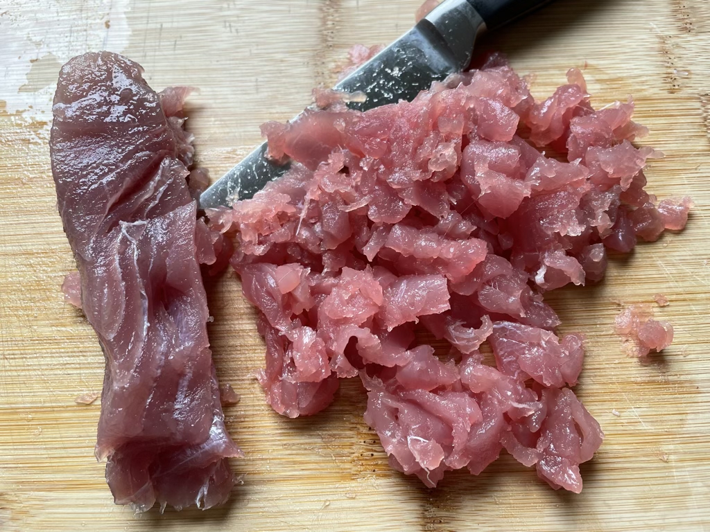 Déchiqueter le poisson à l’aide d’un couteau jusqu’à ce qu’il soit très fin.