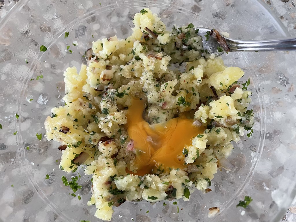 Ajouter le poisson au mélange pendant que les pommes de terre sont encore chaudes. Incorporer ensuite le jaune d’oeuf et assaisonner de sel et de poivre.